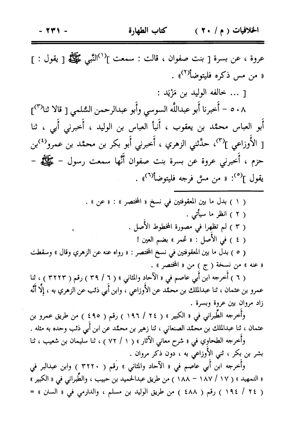 508- أخبرنا أبو عبد الله السوسي وأبو عبد الرحمن السلمي [قالا ثنا] أبو العباس محمد بن يعقوب، أنبأ العباس بن الوليد، أخبرني أبي، ثنا [الأوزاعي]، حدثني الزهري، أخبرني أبو بكر بن محمد بن عمرو بن حزم، أخبرني عروة عن بسرة بنت صفوان أنها سمعت رسول الله - صلى الله عليه وسلم - يقول]: ((من مس فرجه فليتوضأ)).