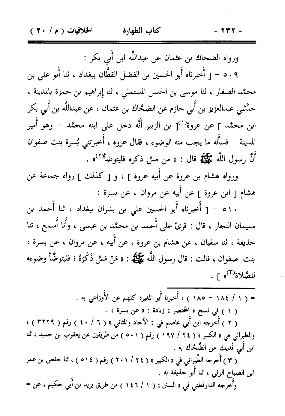 510- [أخبرناه أبو الحسين علي بن بشران ببغداد، ثنا أحمد بن سليمان النجار، قال: قرئ على أحمد بن محمد بن عيسى، وأنا أسمع، ثنا حذيفة، ثنا سفيان، عن هشام بن عروة، عن أبيه، عن مروان، عن بسرة بنت صفوان قالت: قال رسول الله صلى الله عليه وسلم : ((من مس ذكره؛ فليتوضأ وضوءه للصلاة))].