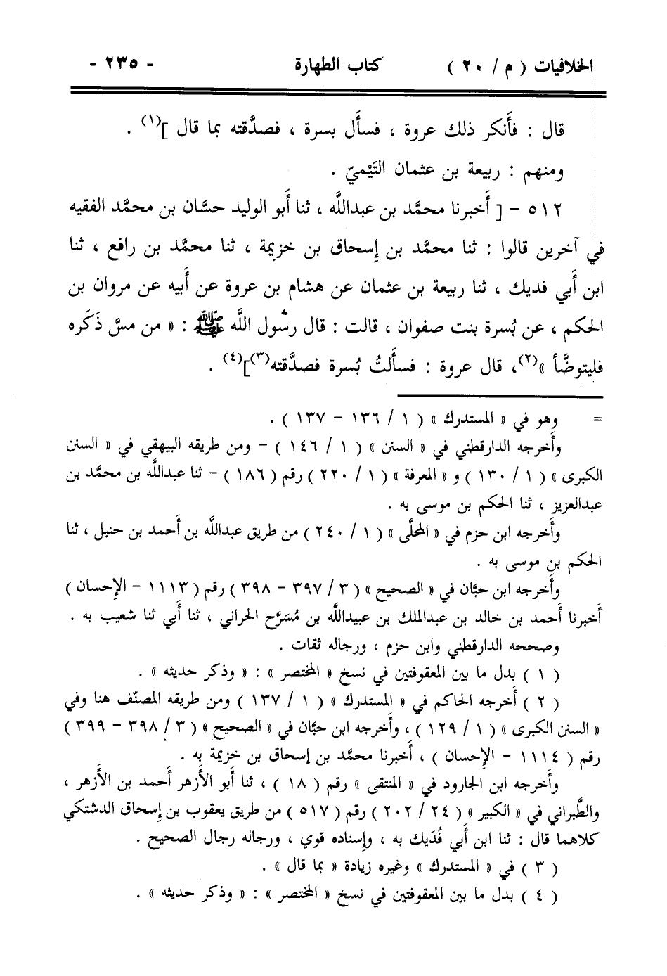 512- [أخبرنا محمد بن عبد الله، ثنا أبو الوليد حسان بن محمد الفقيه في آخرين قالوا: ثنا محمد بن إسحاق بن خزيمة، ثنا محمد بن رافع، ثنا ابن أبي فديك، ثنا ربيعة بن عثمان عن هشام بن عروة عن أبيه عن مروان بن الحكم، عن بسرة بنت صفوان، قالت: قال رسول الله صلى الله عليه وسلم : ((من مس ذكره فليتوضأ))، قال عروة، فسألت بسرة فصدقته].