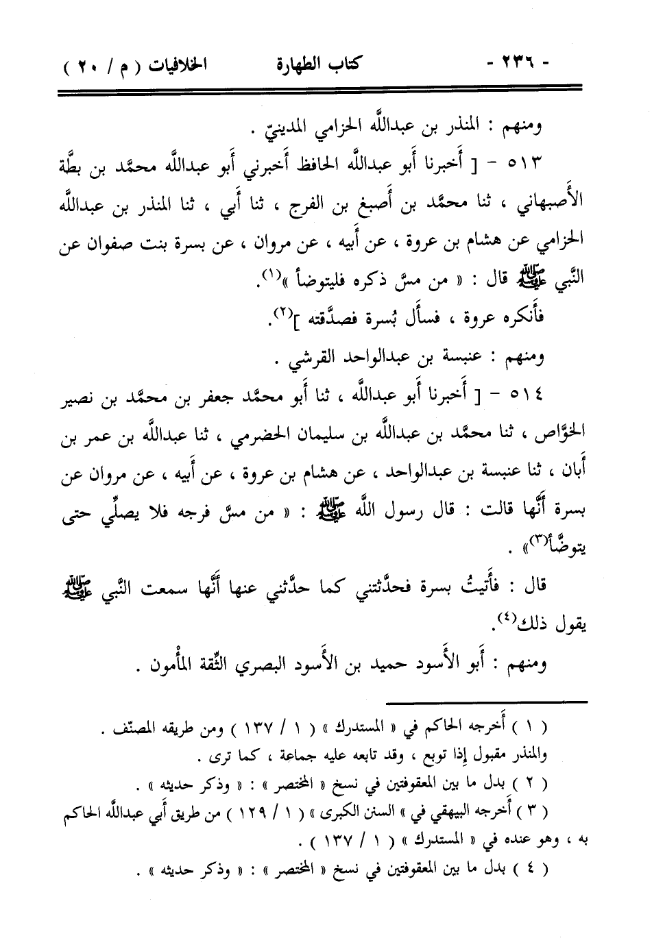 513- [أخبرنا أبو عبد الله الحافظ أخبرني أبو عبد الله محمد بن بطة الأصبهاني، ثنا محمد بن أصبغ بن الفرج، ثنا أبي، ثنا المنذر بن عبد الله الحزامي عن هشام بن عروة، عن أبيه، عن مروان، عن بسرة بنت صفوان عن النبي صلى الله عليه وسلم قال: ((من مس ذكره فليتوضأ)).