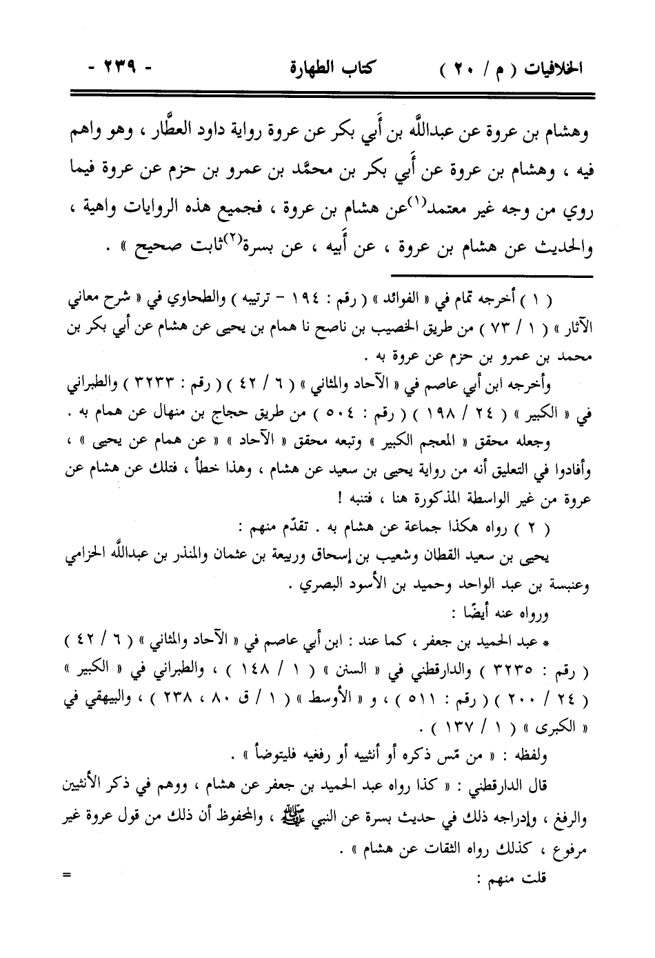 وهشام بن عروة عن عبد الله بن أبي بكر عن عروة رواية داود العطار، وهو واهم فيه، وهشام بن عروة عن أبي بكر بن محمد بن عمرو بن حزم عن عروة فيما روي من وجه غير معتمد عن هشام بن عروة، فجميع هذه الروايات واهية، والحديث عن هشام بن عروة، عن أبيه، عن بسرة ثابت صحيح)).