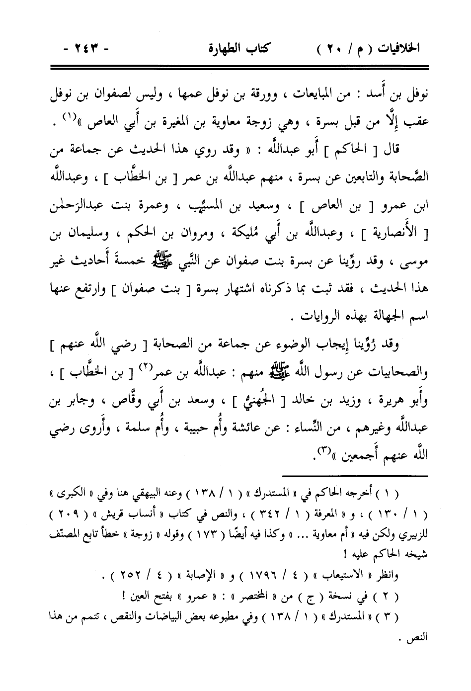 قال [الحاكم] أبو عبد الله]: وقد روي هذا الحديث عن جماعة من الصحابة والتابعين عن بسرة، منهم عبد الله بن عمر [بن الخطاب]، وعبد الله ابن عمرو [بن العاص]، وسعيد بن المسيب، وعمرة بنت عبد الرحمن [الأنصارية]، وعبد الله بن أبي مليكة، ومروان بن الحكم، وسليمان بن موسى، وقد روينا عن بسرة بنت صفوان عن النبي صلى الله عليه وسلم خمسة أحاديث غير هذا الحديث، فقد ثبت بما ذكرناه اشتهار بسرة [بنت صفوان] وارتفع عنها اسم الجهالة بهذه الروايات.