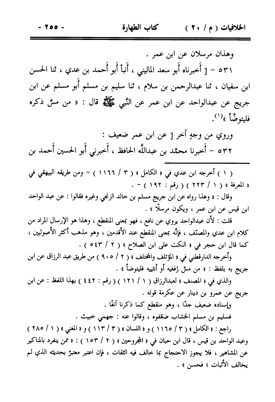 531- [أخبرناه أبو سعد الماليني، أنبأ أبو أحمد بن عدي، ثنا الحسن ابن سفيان، ثنا عبد الرحمن بن سلام، ثنا سليم بن مسلم أبو مسلم عن ابن جريج عن عبد الواحد عن ابن عمر عن النبي صلى الله عليه وسلم قال: ((من مس ذكره فليتوضأ)).