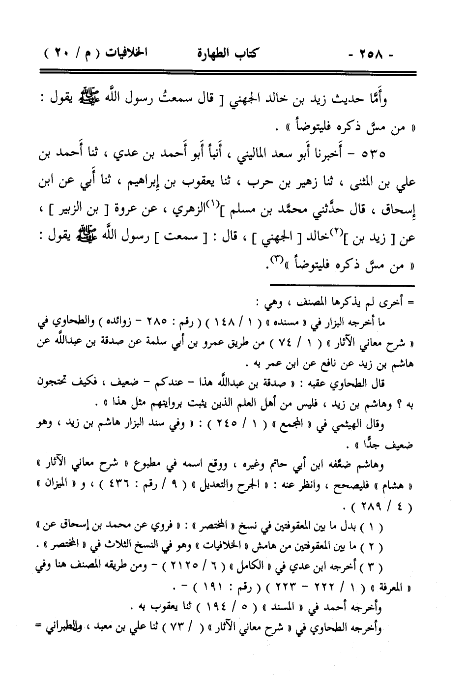 535- أخبرنا أبو سعد الماليني، أنبأ أبو أحمد بن عدي، ثنا أحمد بن علي بن المثنى، ثنا زهير بن حرب، ثنا يعقوب بن إبراهيم، ثنا أبي عن ابن إسحاق، قال حدثني محمد بن مسلم] الزهري، عن عروة [بن الزبير]، عن [زيد بن] خالد [الجهني] قال: [سمعت] رسول الله صلى الله عليه وسلم يقول: ((من مس ذكره فليتوضأ)).
