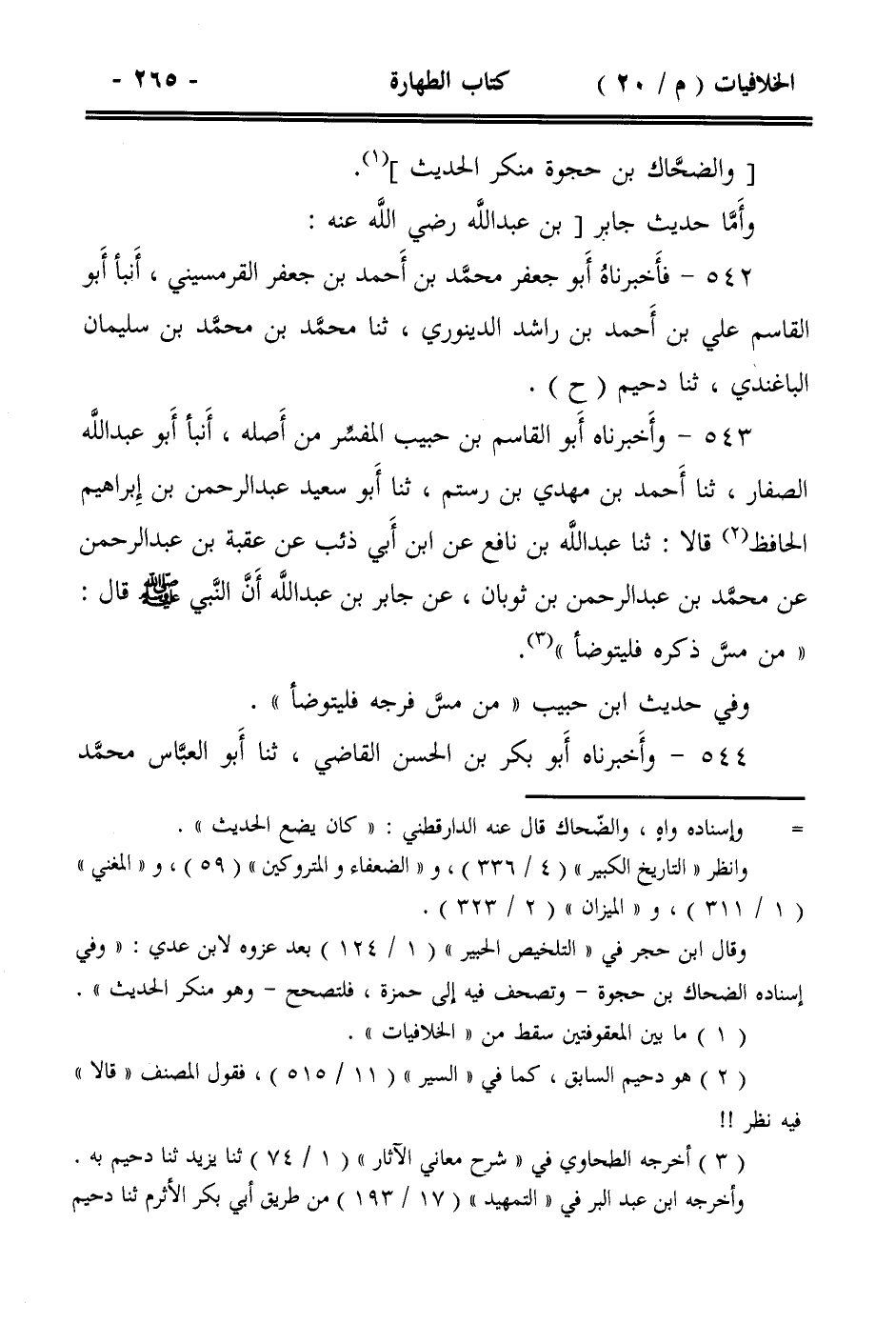 543- وأخبرناه أبو القاسم بن حبيب المفسر من أصله، أنبأ أبو عبد الله الصفار، ثنا أحمد بن مهدي بن رستم، ثنا أبو سعيد عبد الرحمن بن إبراهيم الحافظ قالا: ثنا عبد الله بن نافع عن ابن أبي ذئب عن عقبة بن عبد الرحمن عن محمد بن عبد الرحمن بن ثوبان، عن جابر بن عبد الله أن النبي صلى الله عليه وسلم قال: ((من مس ذكره فليتوضأ)).