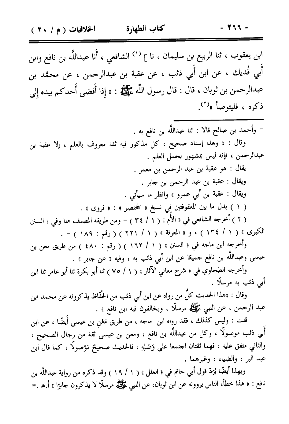 ابن يعقوب، ثنا الربيع بن سليمان، نا] الشافعي، أنا عبد الله بن نافع وابن أبي فديك، عن ابن أبي ذئب، عن عقبة بن عبد الرحمن، عن محمد بن عبد الرحمن بن ثوبان، قال: قال رسول الله صلى الله عليه وسلم : ((إذا أفضى أحدكم بيده إلى ذكره، فليتوضأ)).