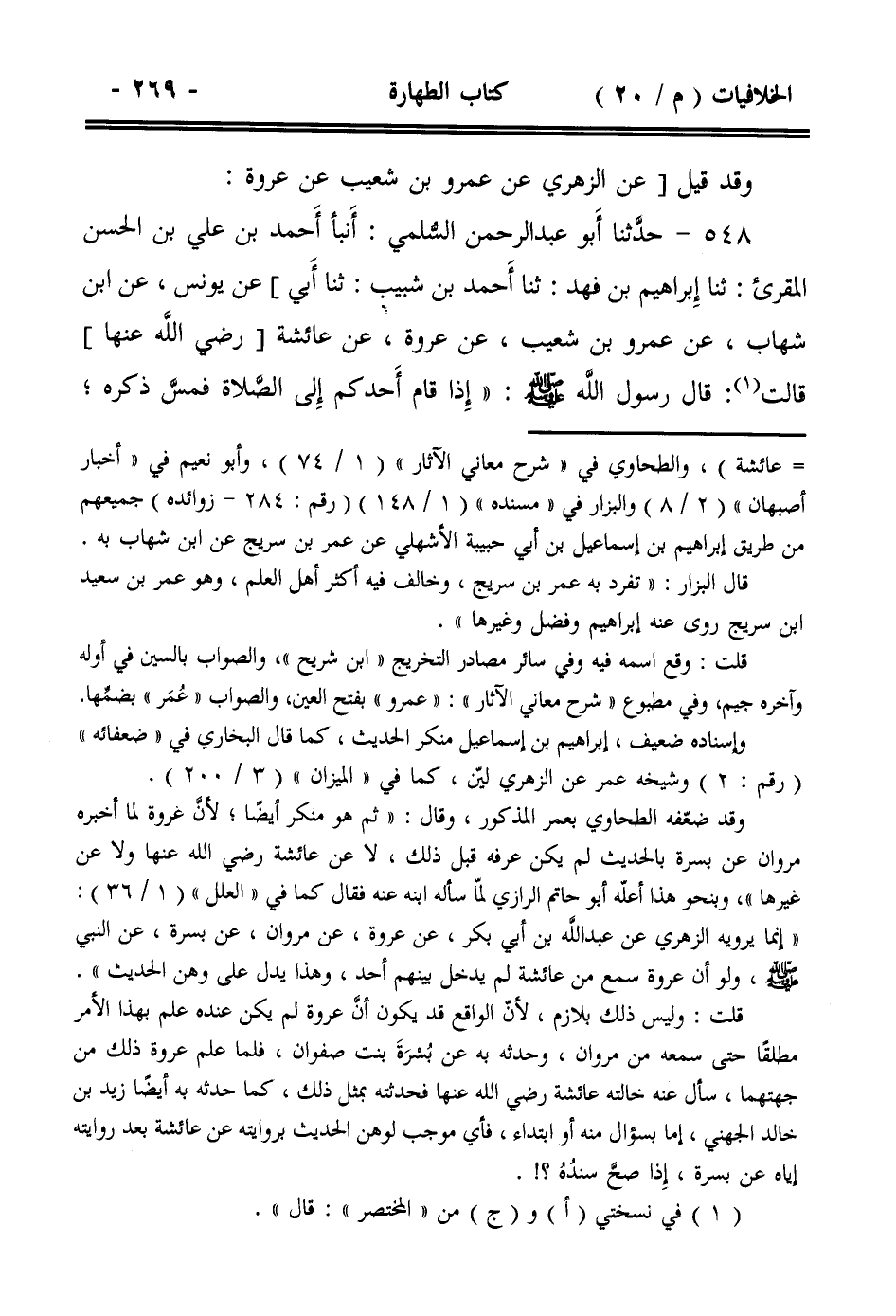 548- حدثنا أبو عبد الرحمن السلمي: أنبأ أحمد بن علي بن الحسن المقرئ: ثنا إبراهيم بن فهد: ثنا أحمد بن شبيب: ثنا أبي] عن يونس، عن ابن شهاب، عن عمرو بن شعيب، عن عروة، عن عائشة [رضي الله عنها] قالت: قال رسول الله صلى الله عليه وسلم : ((إذا قام أحدكم إلى الصلاة فمس ذكره؛
