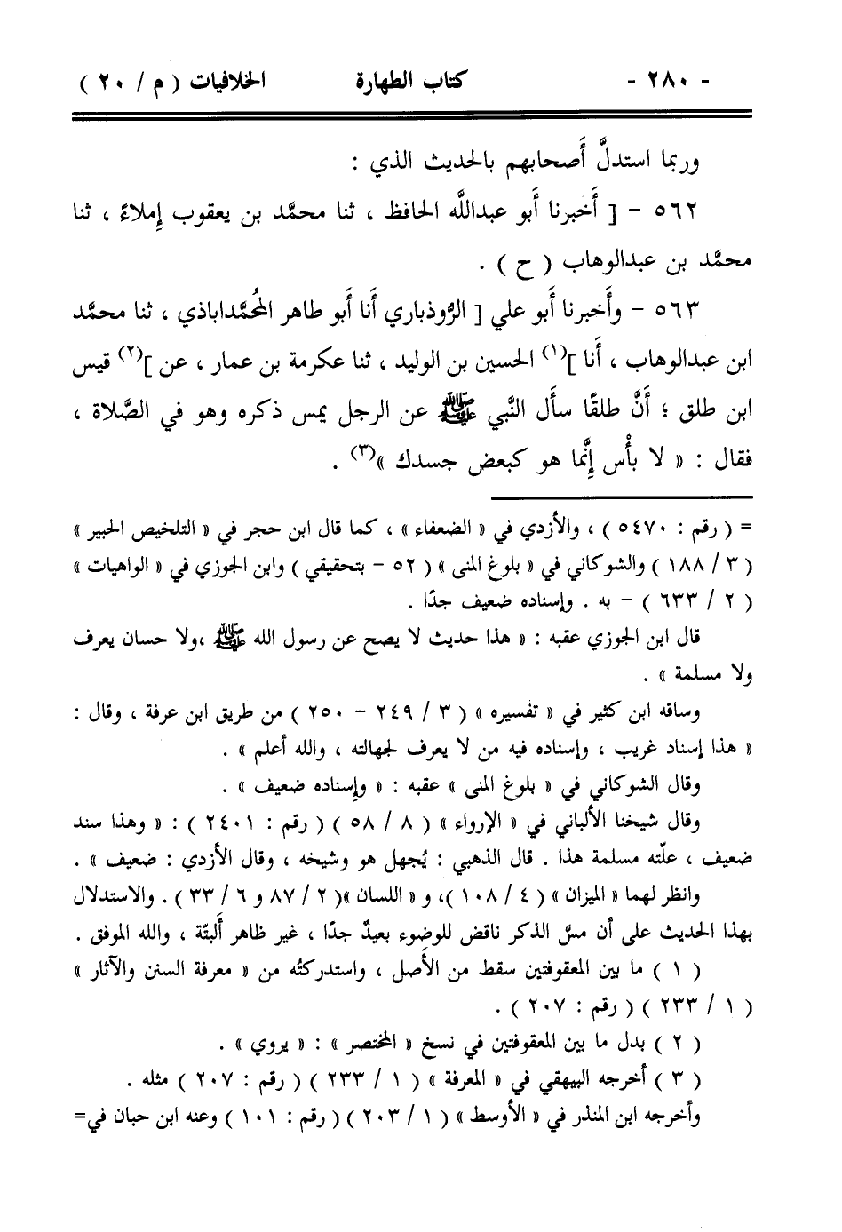 563- وأخبرنا أبو علي [الروذباري أنا أبو طاهر المحمداباذي، ثنا محمد ابن عبد الوهاب، أنا] الحسين بن الوليد، ثنا عكرمة بن عمار، عن] قيس ابن طلق؛ أن طلقاً سأل النبي صلى الله عليه وسلم عن الرجل يمس ذكره وهو في الصلاة، فقال: ((لا بأس إنما هو كبعض جسدك)).