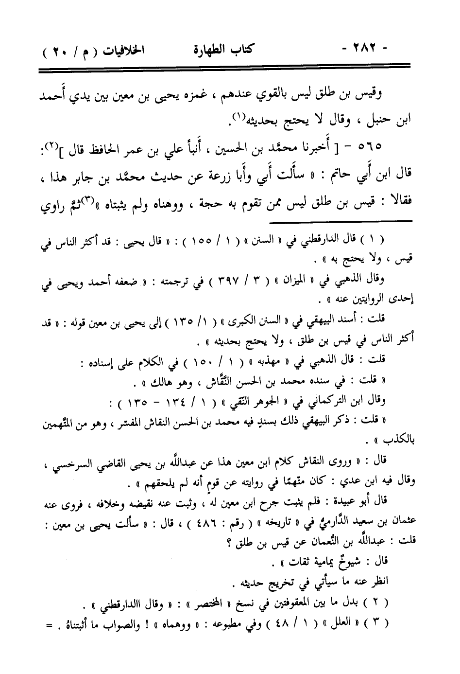 565- [أخبرنا محمد بن الحسين، أنبأ علي بن عمر الحافظ قال]: قال ابن أبي حاتم: ((سألت أبي وأبا زرعة عن حديث محمد بن جابر هذا، فقالا: قيس بن طلق ليس ممن تقوم به حجة، ووهناه ولم يثبتاه)) ثم راوي