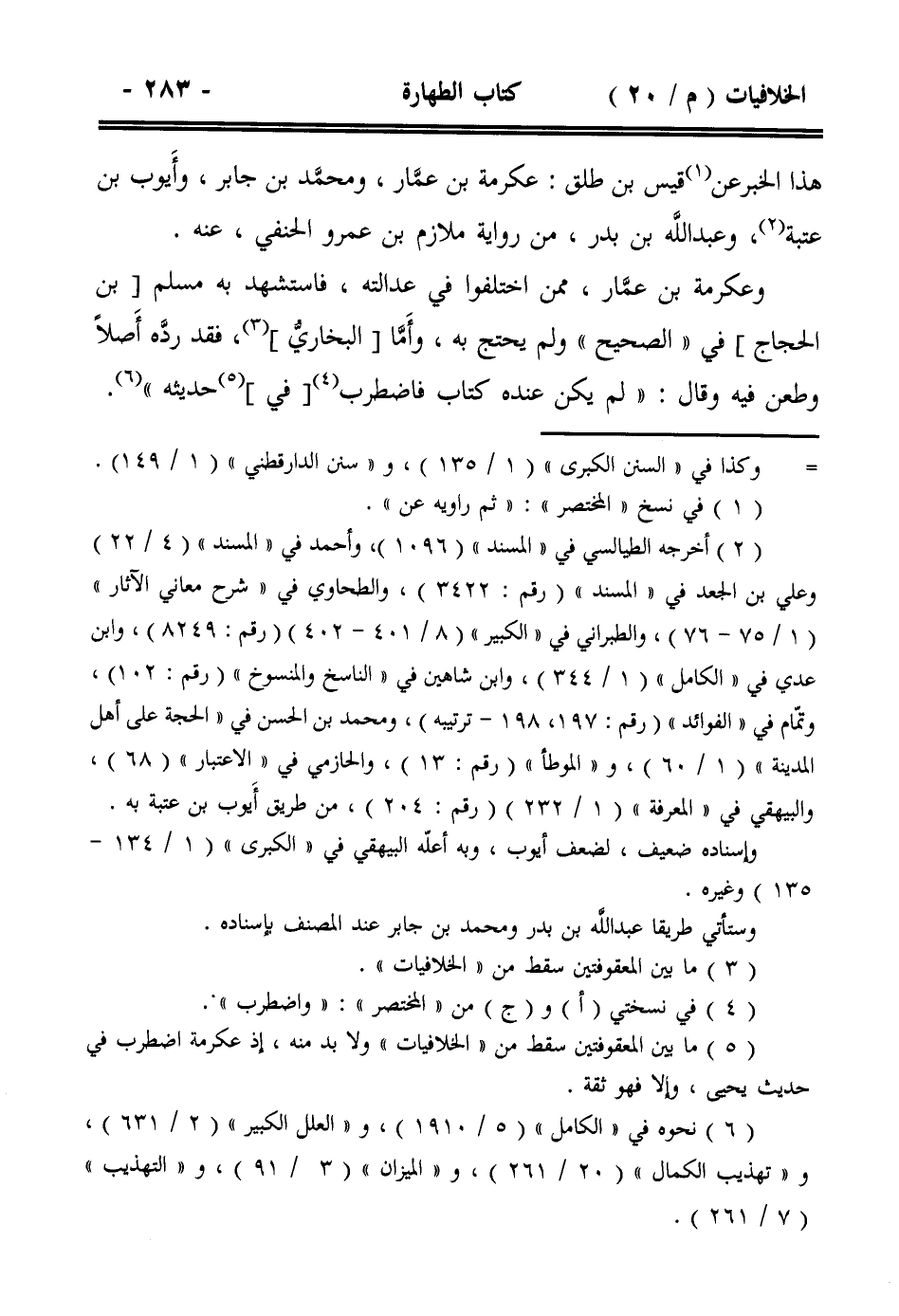 وعكرمة بن عمار، ممن اختلفوا في عدالته، فاستشهد به مسلم [بن الحجاج] في ((الصحيح)) ولم يحتج به، وأما [البخاري]، فقد رده أصلاً وطعن فيه وقال: ((لم يكن عنده كتاب فاضطرب [في] حديثه)).