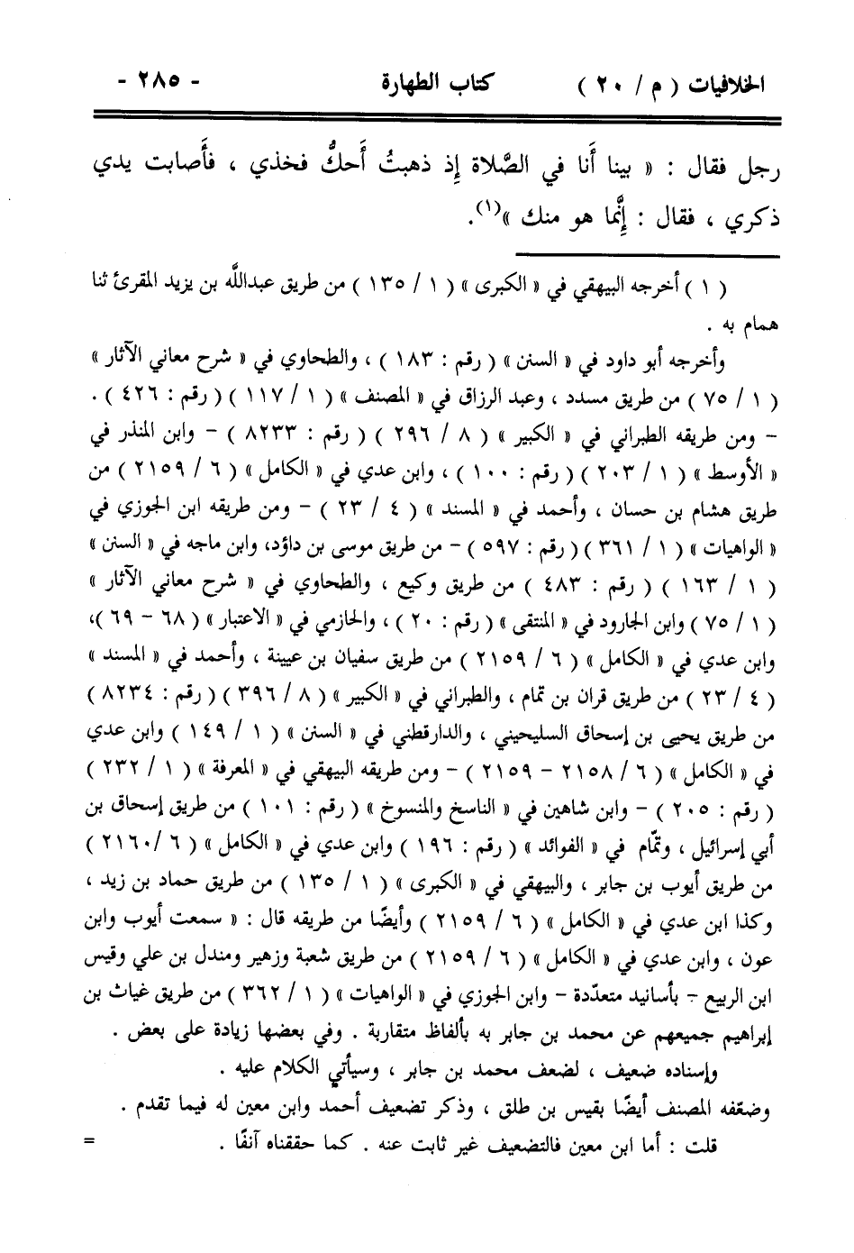 رجل فقال: ((بينا أنا في الصلاة إذ ذهبت أحك فخذي، فأصابت يدي ذكري، فقال: إنما هو منك)).