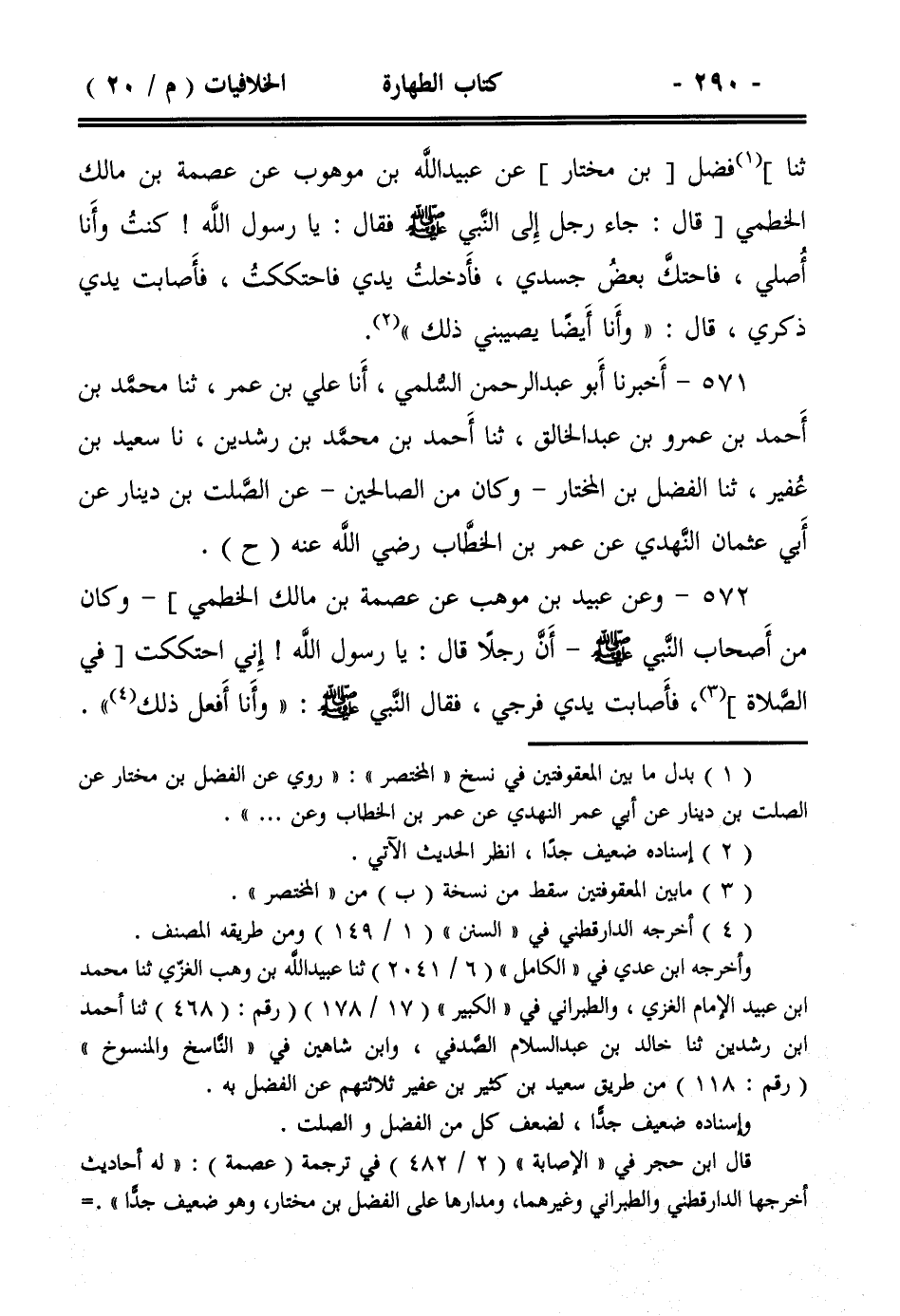 ثنا] فضل [بن مختار] عن عبيد الله بن موهوب عن عصمة بن مالك الخطمي [قال: جاء رجل إلى النبي صلى الله عليه وسلم فقال: يا رسول الله! كنت وأنا أصلي، فاحتك بعض جسدي، فأدخلت يدي فاحتككت، فأصابت يدي ذكري، قال: ((وأنا أيضاً يصيبني ذلك)).