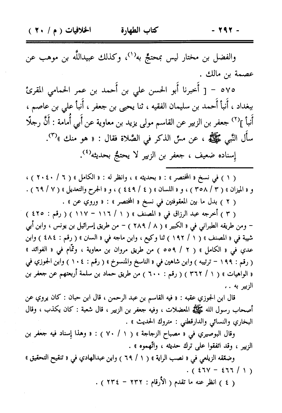 575- [أخبرنا أبو الحسن علي بن أحمد بن عمر الحمامي المقرئ ببغداد، أنبأ أحمد بن سليمان الفقيه، ثنا يحيى بن جعفر، أنبأ علي بن عاصم، أنبأ] جعفر بن الزبير عن القاسم مولى يزيد بن معاوية عن أبي أمامة: أن رجلاً سأل النبي صلى الله عليه وسلم ، عن مس الذكر في الصلاة فقال: ((هو منك)).