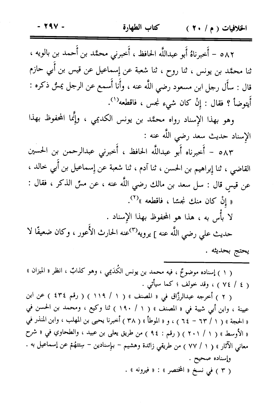 582- أخبرناه أبو عبد الله الحافظ، أخبرني محمد بن أحمد بن بالويه، ثنا محمد بن يونس، ثنا روح، ثنا شعبة عن إسماعيل عن قيس بن أبي حازم قال: سأل رجل ابن مسعود رضي الله عنه، وأنا أسمع عن الرجل يمس ذكره: أيتوضأ؟ فقال: إن كان شيء نجس، فاقطعه.