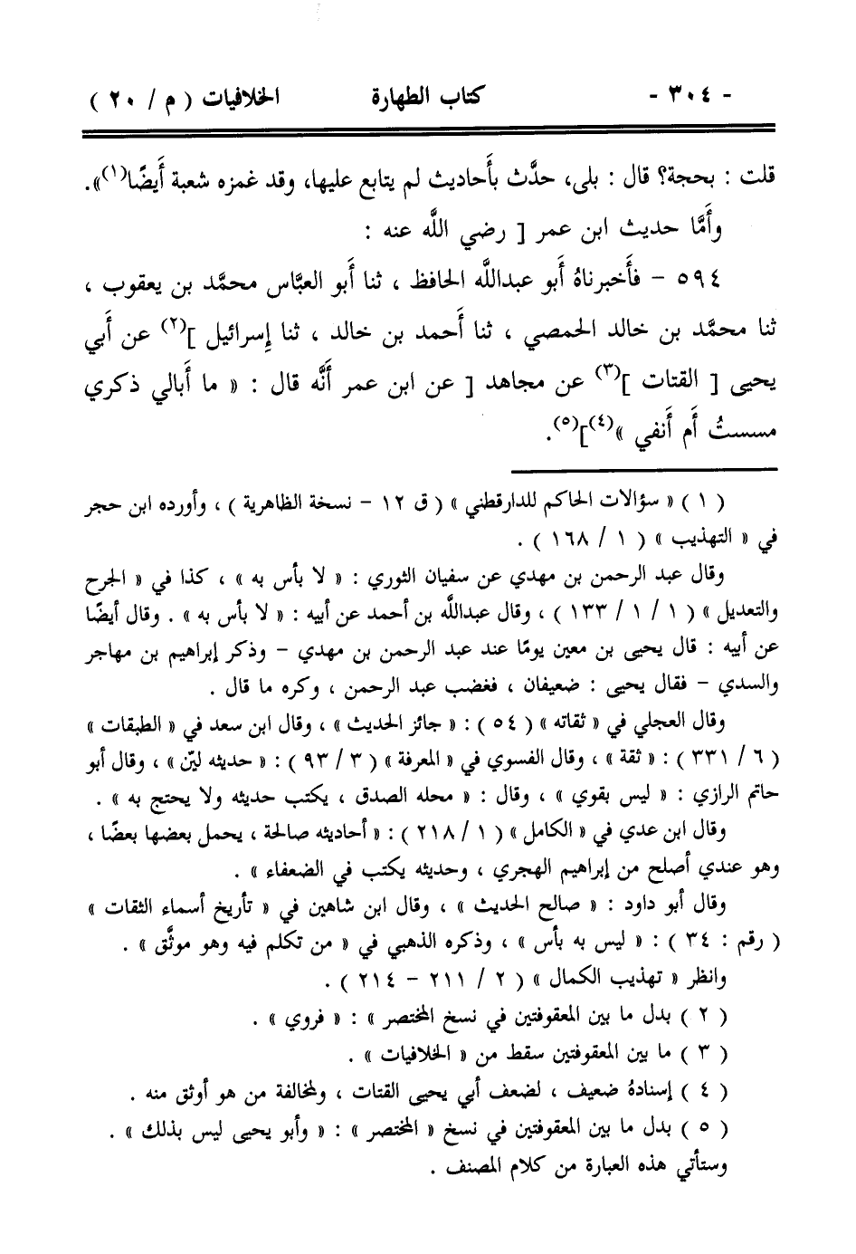 594- فأخبرناه أبو عبد الله الحافظ، ثنا أبو العباس محمد بن يعقوب، ثنا محمد بن خالد الحمصي، ثنا أحمد بن خالد، ثنا إسرائيل] عن أبي يحيى [القتات] عن مجاهد [عن ابن عمر أنه قال: ((ما أبالي ذكري مسست أم أنفي))].
