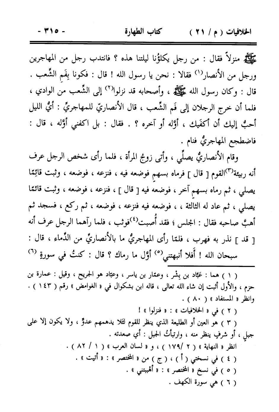 وقام الأنصاري يصلي، وأتى زوج المرأة، فلما رأى شخص الرجل عرف أنه ربيئة القوم [قال] فرماه بسهمٍ فوضعه فيه، فنزعه، فوضعه، وثبت قائماً يصلي، ثم رماه بسهمٍ آخر، فوضعه فيه [قال]، فنزعه، فوضعه، وثبت قائماً يصلي، ثم عاد له الثالثة، فوضعه فيه فنزعه، فوضعه، ثم ركع، فسجد ثم أهب صاحبه فقال: اجلس؛ فقد أصبت فوثب، فلما رآهما الرجل عرف أنه [قد] نذر به فهرب، فلما رأى المهاجري بما بالأنصاري من الدماء، قال: