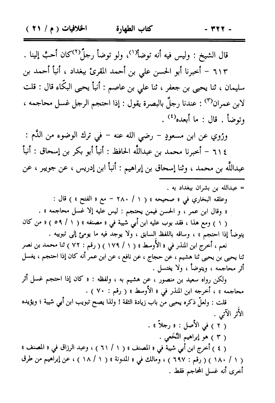 613- أخبرنا أبو الحسن علي بن أحمد المقرئ ببغداد، أنبأ أحمد بن سليمان، ثنا يحيى بن جعفر، ثنا علي بن عاصم: أنبأ يحيى البكاء قال: قلت لابن عمران: عندنا رجلٌ بالبصرة يقول: إذا احتجم الرجل غسل محاجمه، وتوضأ. قال: ما أبعده.