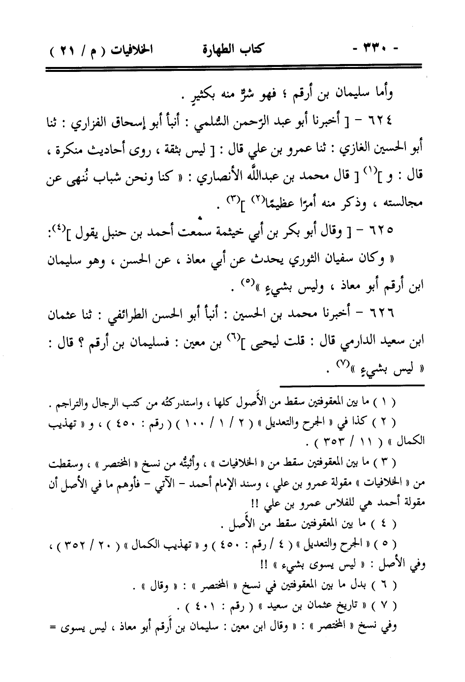 626- أخبرنا محمد بن الحسين: أنبأ أبو الحسن الطرائفي: ثنا عثمان ابن سعيد الدارمي قال: قلت ليحيى] بن معين: فسليمان بن أرقم؟ قال: ((ليس بشيءٍ)).