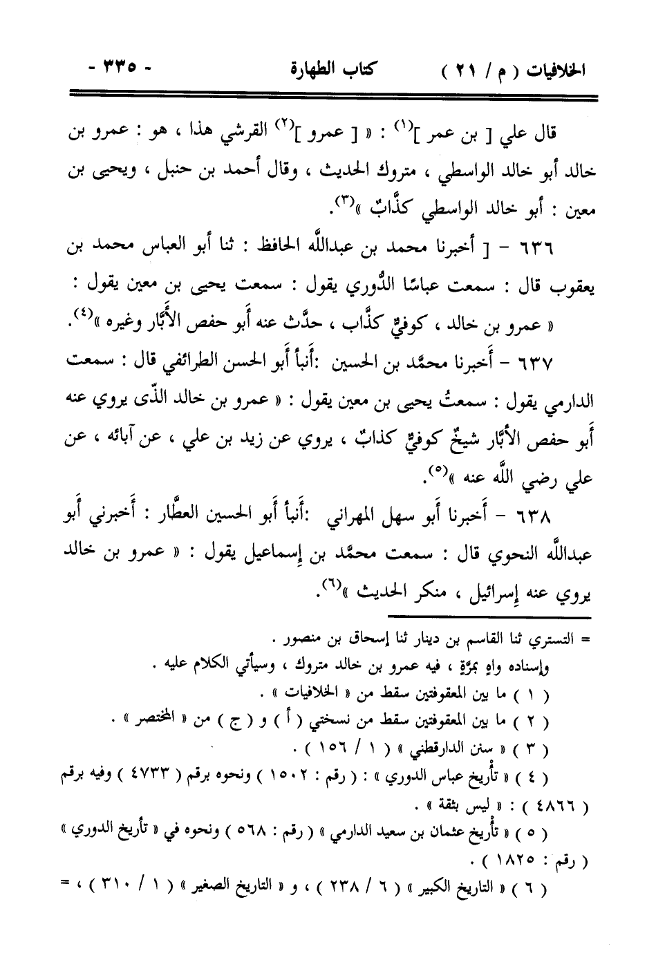 637- أخبرنا محمد بن الحسين: أنبأ أبو الحسن الطرائفي قال: سمعت الدارمي يقول: سمعت يحيى بن معين يقول: ((عمرو بن خالد الذي يروي عنه أبو حفص الأبار شيخٌ كوفي كذابٌ، يروي عن زيد بن علي، عن آبائه، عن علي رضي الله عنه)).