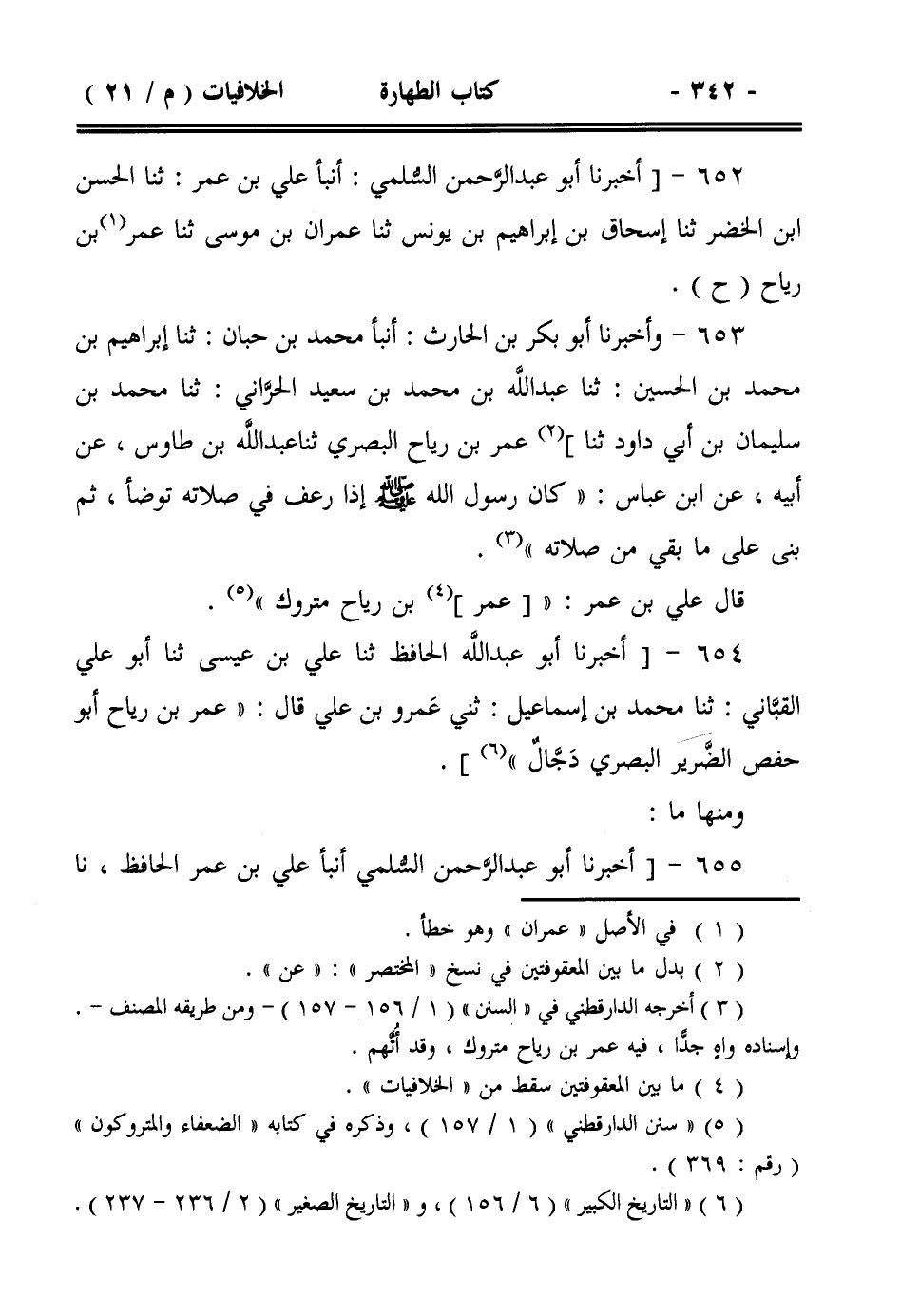 652- [أخبرنا أبو عبد الرحمن السلمي: أنبأ علي بن عمر: ثنا الحسن ابن الخضر ثنا إسحاق بن إبراهيم بن يونس ثنا عمران بن موسى ثنا عمر بن رياح (ح).