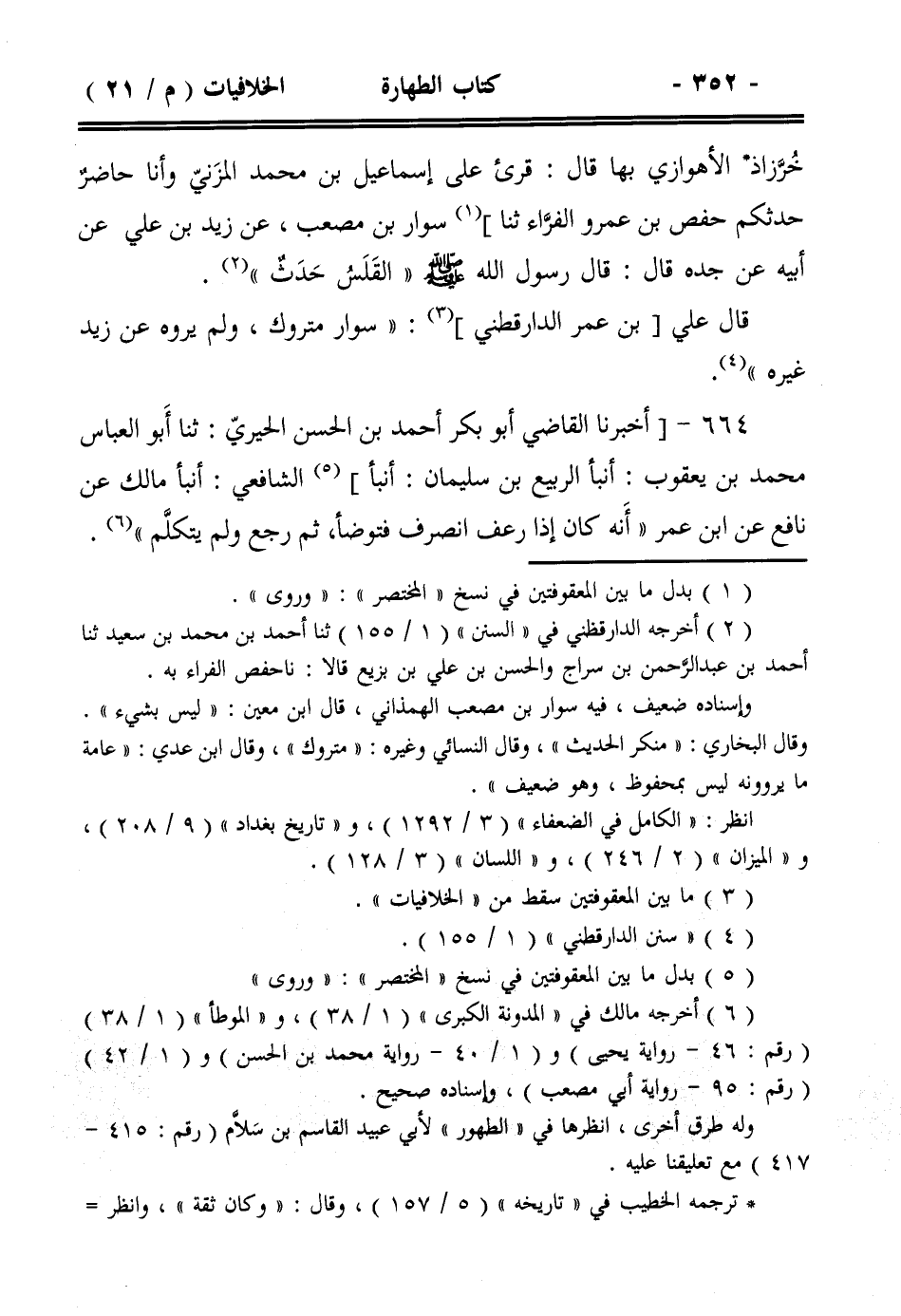 664- [أخبرنا القاضي أبو بكر أحمد بن الحسن الحيري: ثنا أبو العباس محمد بن يعقوب: أنبأ الربيع بن سليمان: أنبأ] الشافعي: أنبأ مالك عن نافع عن ابن عمر ((أنه كان إذا رعف انصرف فتوضأ، ثم رجع ولم يتكلم)).