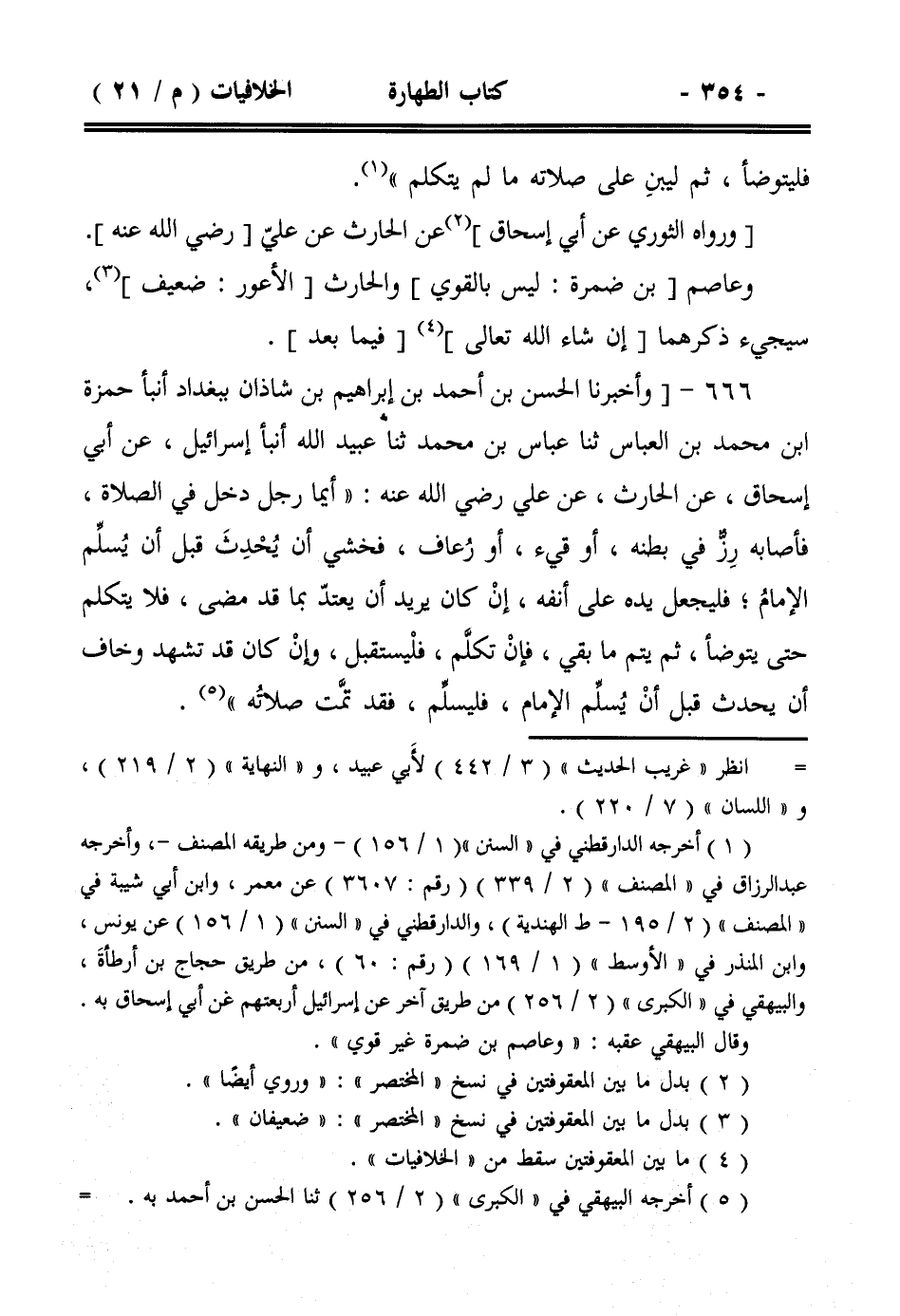 666- [وأخبرنا الحسن بن أحمد بن إبراهيم بن شاذان ببغداد أنبأ حمزة ابن محمد بن العباس ثنا عباس بن محمد ثنا عبيد الله أنبأ إسرائيل، عن أبي إسحاق، عن الحارث، عن علي رضي الله عنه: ((أيما رجل دخل في الصلاة، فأصابه رز في بطنه، أو قيء، أو رعاف، فخشي أن يحدث قبل أن يسلم الإمام؛ فليجعل يده على أنفه، إن كان يريد أن يعتد بما قد مضى، فلا يتكلم حتى يتوضأ، ثم يتم ما بقي، فإن تكلم، فليستقبل، وإن كان قد تشهد وخاف أن يحدث قبل أن يسلم الإمام، فليسلم، فقد تمت صلاته)).