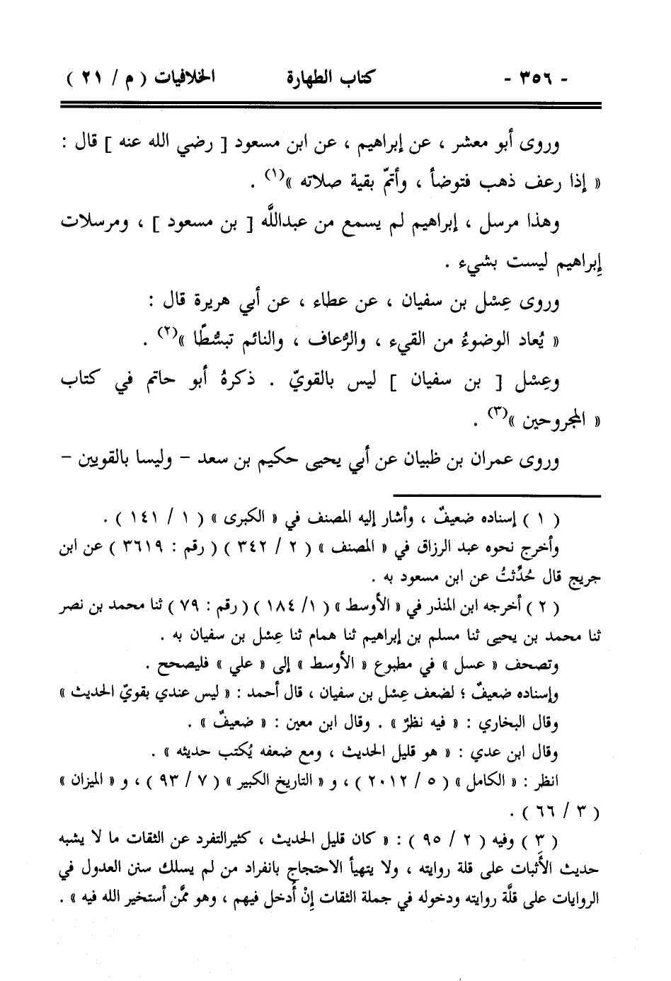 وروى أبو معشر، عن إبراهيم، عن ابن مسعود [رضي الله عنه] قال: ((إذا رعف ذهب فتوضأ، وأتم بقية صلاته)).