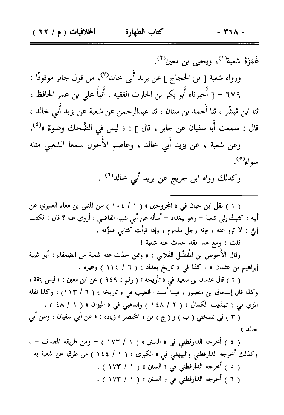 679- [أخبرناه أبو بكر بن الحارث الفقيه، أنبأ علي بن عمر الحافظ، ثنا ابن مبشر، ثنا أحمد بن سنان، ثنا عبد الرحمن عن شعبة عن يزيد أبي خالد، قال: سمعت أبا سفيان عن جابر، قال]: ((ليس في الضحك وضوءٌ)).