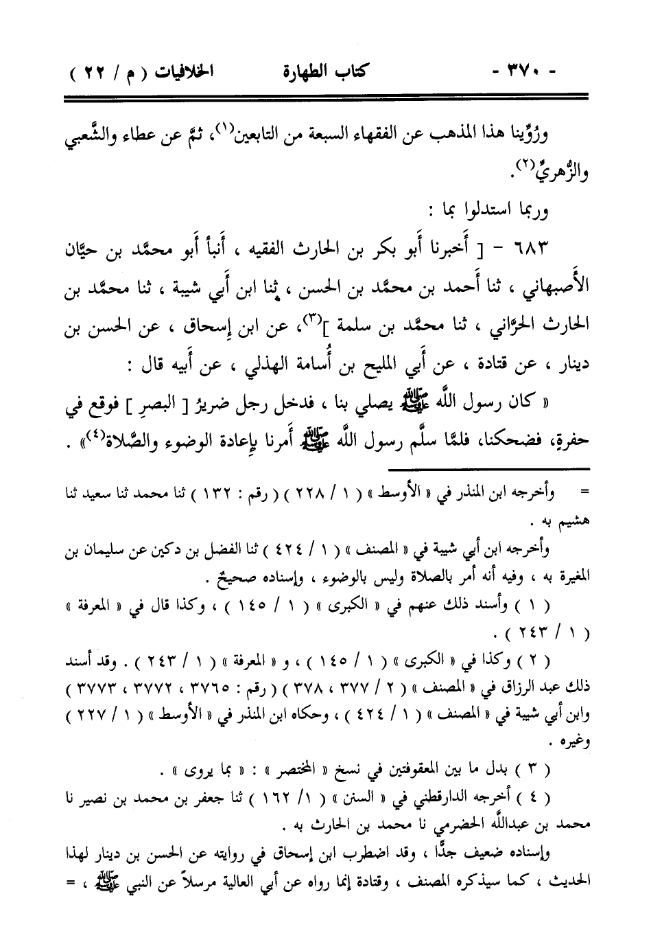 683- [أخبرنا أبو بكر بن الحارث الفقيه، أنبأ أبو محمد بن حيان الأصبهاني، ثنا أحمد بن محمد بن الحسن، ثنا ابن أبي شيبة، ثنا محمد بن الحارث الحراني، ثنا محمد بن سلمة]، عن ابن إسحاق، عن الحسن بن دينار، عن قتادة، عن أبي المليح بن أسامة الهذلي، عن أبيه قال: