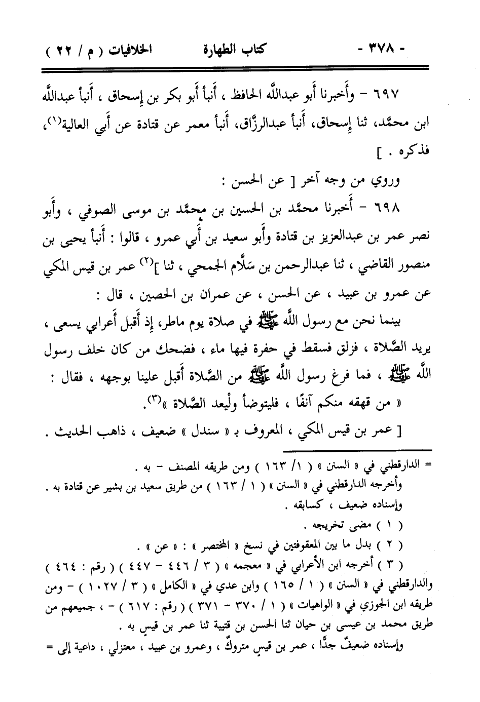 698- أخبرنا محمد بن الحسين بن محمد بن موسى الصوفي، وأبو نصر عمر بن عبد العزيز بن قتادة وأبو سعيد بن أبي عمرو، قالوا: أنبأ يحيى بن منصور القاضي، ثنا عبد الرحمن بن سلام الجمحي، ثنا] عمر بن قيس المكي عن عمرو بن عبيد، عن الحسن، عن عمران بن الحصين، قال: