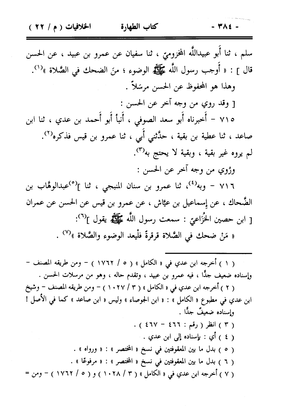 سلم، ثنا أبو عبيد الله المخزومي، ثنا سفيان عن عمرو بن عبيد، عن الحسن قال]: ((أوجب رسول الله صلى الله عليه وسلم الوضوء؛ من الضحك في الصلاة)).