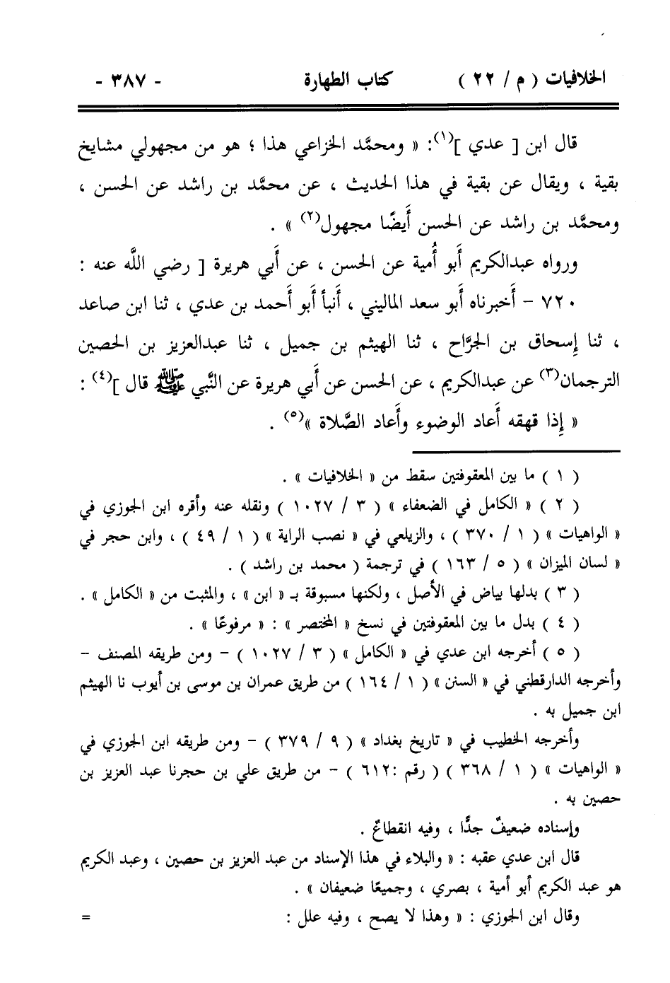 قال ابن [عدي]: ((ومحمد الخزاعي هذا؛ هو من مجهولي مشايخ بقية، ويقال عن بقية في هذا الحديث، عن محمد بن راشد عن الحسن، ومحمد بن راشد عن الحسن أيضاً مجهول)).