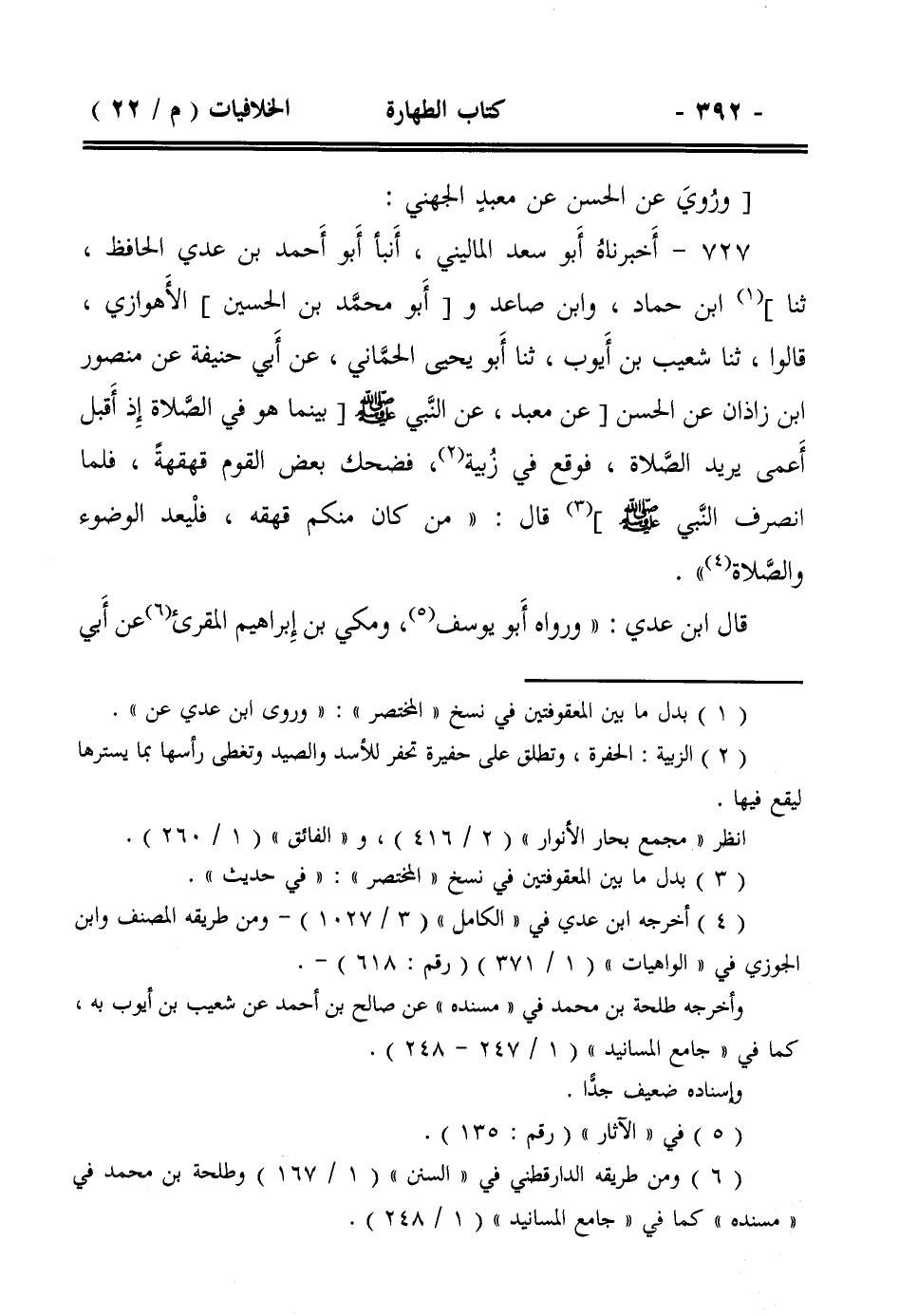 727- أخبرناه أبو سعد الماليني، أنبأ أبو أحمد بن عدي الحافظ، ثنا] ابن حماد، وابن صاعد و[أبو محمد بن الحسين] الأهوازي، قالوا: ثنا شعيب بن أيوب، ثنا أبو يحيى الحماني، عن أبي حنيفة عن منصور ابن زاذان عن الحسن [عن معبد، عن النبي صلى الله عليه وسلم [بينما هو في الصلاة إذ أقبل أعمى يريد الصلاة، فوقع في زبية، فضحك بعض القوم قهقهةً، فلما انصرف النبي صلى الله عليه وسلم ] قال: ((من كان منكم قهقه، فليعد الوضوء والصلاة)).
