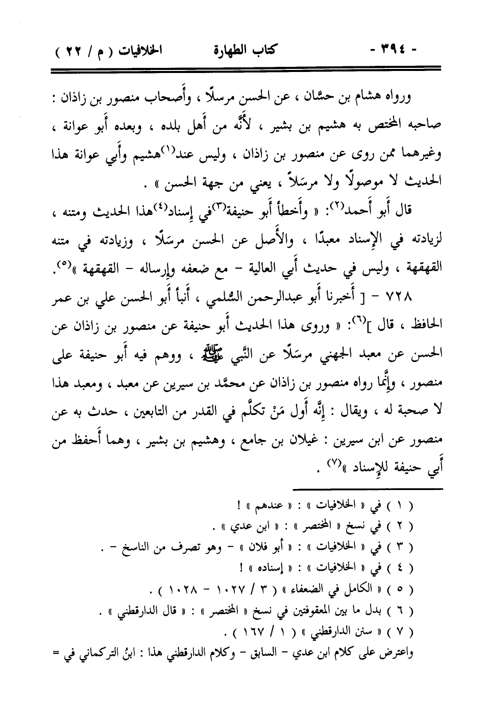 728- [أخبرنا أبو عبد الرحمن السلمي، أنبأ أبو الحسن علي بن عمر الحافظ، قال]: ((وروى هذا الحديث أبو حنيفة عن منصور بن زاذان عن الحسن عن معبد الجهني مرسلاً عن النبي صلى الله عليه وسلم ، ووهم فيه أبو حنيفة على منصور، وإنما رواه منصور بن زاذان عن محمد بن سيرين عن معبد، ومعبد هذا لا صحبة له، ويقال: إنه أول من تكلم في القدر من التابعين، حدث به عن منصور عن ابن سيرين: غيلان بن جامع، وهشيم بن بشير، وهما أحفظ من أبي حنيفة للإسناد)).