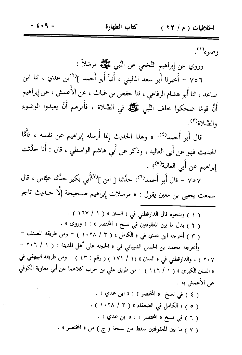 756- أخبرنا أبو سعد الماليني، أنبأ أبو أحمد] بن عدي، ثنا ابن صاعد، ثنا أبو هشام الرفاعي، ثنا حفص بن غياث، عن الأعمش، عن إبراهيم أن قوماً ضحكوا خلف النبي صلى الله عليه وسلم في الصلاة، فأمرهم أن يعيدوا الوضوء والصلاة.