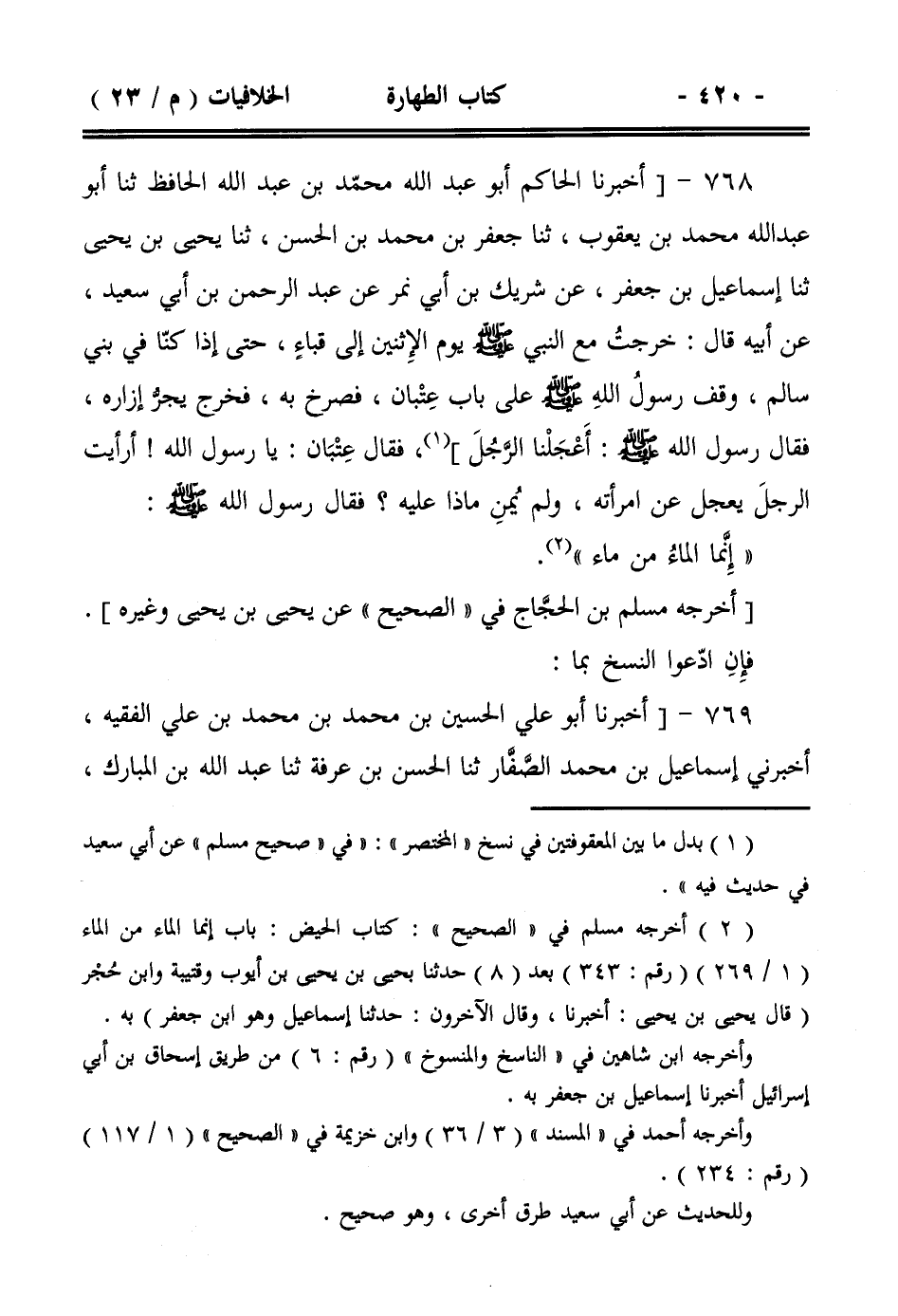 768- [أخبرنا الحاكم أبو عبد الله محمد بن عبد الله الحافظ ثنا أبو عبد الله محمد بن يعقوب، ثنا جعفر بن محمد بن الحسن، ثنا يحيى بن يحيى ثنا إسماعيل بن جعفر، عن شريك بن أبي نمر عن عبد الرحمن بن أبي سعيد، عن أبيه قال: خرجت مع النبي صلى الله عليه وسلم يوم الاثنين إلى قباءٍ، حتى إذا كنا في بني سالم، وقف رسول الله صلى الله عليه وسلم على باب عتبان، فصرخ به، فخرج يجر إزاره، فقال رسول الله صلى الله عليه وسلم : أعجلنا الرجل]، فقال عتبان: يا رسول الله! أرأيت الرجل يعجل عن امرأته، ولم يمن ماذا عليه؟ فقال رسول الله صلى الله عليه وسلم :