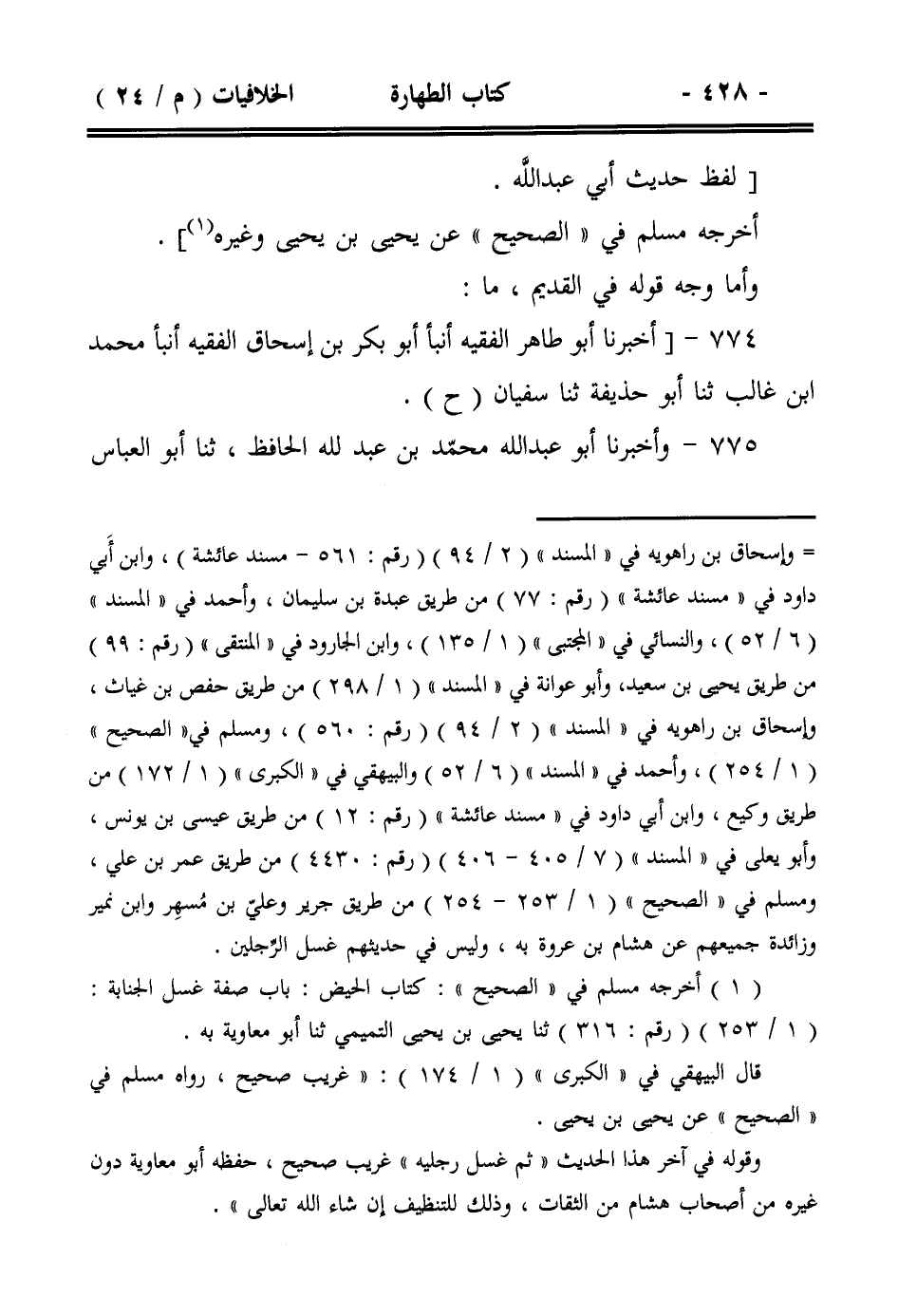 774- [أخبرنا أبو طاهر الفقيه أنبأ أبو بكر بن إسحاق الفقيه أنبأ محمد ابن غالب ثنا أبو حذيفة ثنا سفيان (ح).