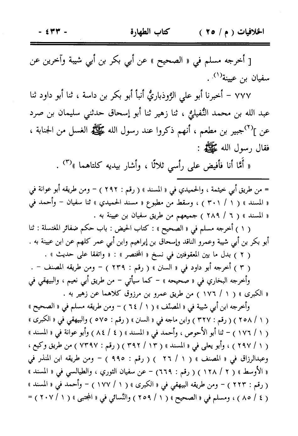 777- أخبرنا أبو علي الروذباري أنبأ أبو بكر بن داسة، ثنا أبو داود ثنا عبد الله بن محمد النفيلي، ثنا زهير ثنا أبو إسحاق حدثني سليمان بن صرد عن] جبير بن مطعم، أنهم ذكروا عند رسول الله صلى الله عليه وسلم الغسل من الجنابة، فقال رسول الله صلى الله عليه وسلم :