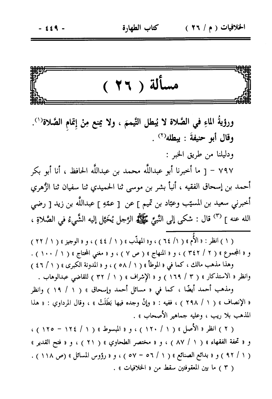 797- [ما أخبرنا أبو عبد الله محمد بن عبد الله الحافظ، أنا أبو بكر أحمد بن إسحاق الفقيه، أنبأ بشر بن موسى ثنا الحميدي ثنا سفيان ثنا الزهري أخبرني سعيد بن المسيب وعباد بن تميم] عن [عمه] عبد الله بن زيد [رضي الله عنه] قال: شكى إلى النبي صلى الله عليه وسلم الرجل يخيل إليه الشيء في الصلاة،