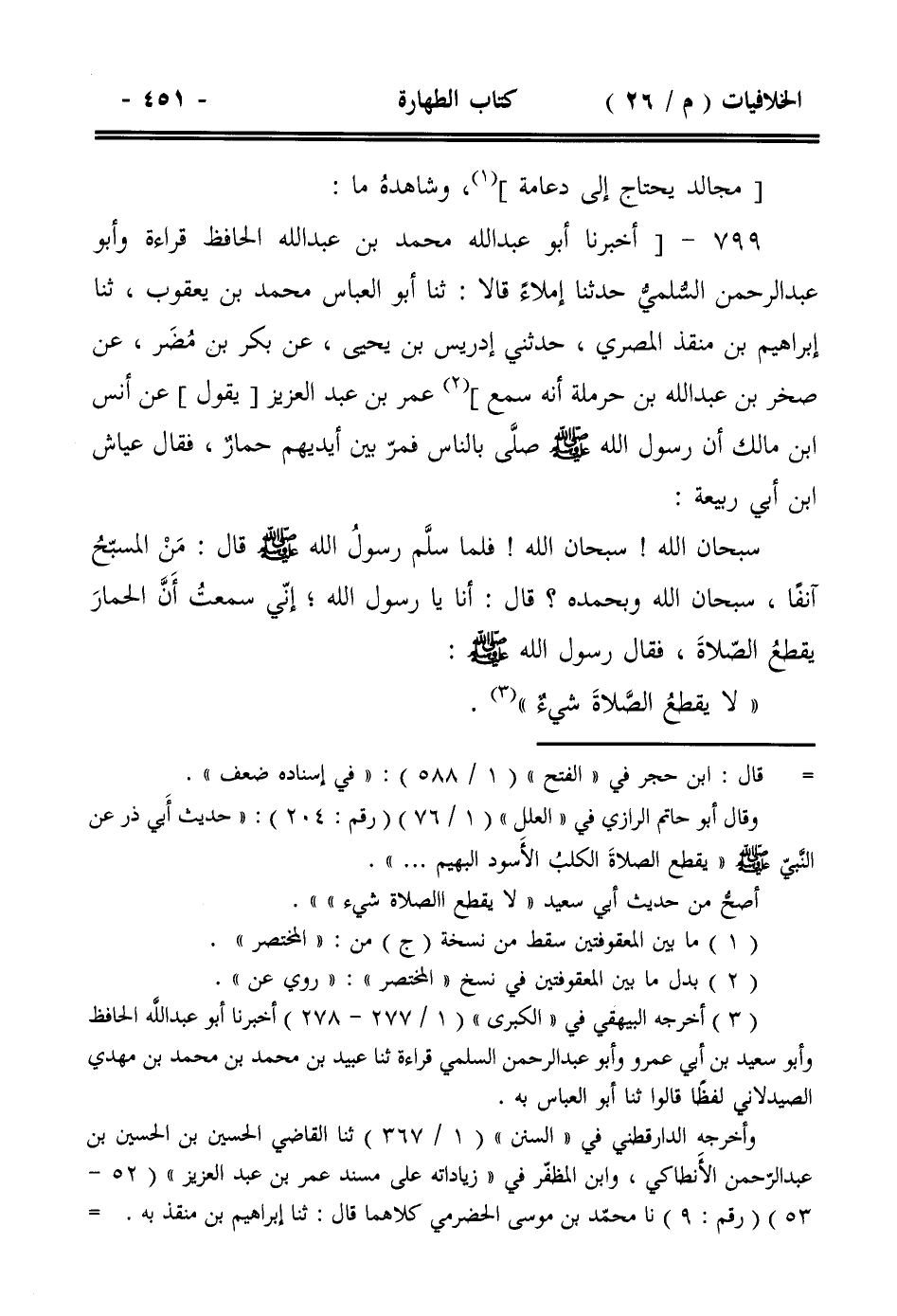 799- [أخبرنا أبو عبد الله محمد بن عبد الله الحافظ قراءة وأبو عبد الرحمن السلمي حدثنا إملاءً قالا: ثنا أبو العباس محمد بن يعقوب، ثنا إبراهيم بن منقذ المصري، حدثني إدريس بن يحيى، عن بكر بن مضر، عن صخر بن عبد الله بن حرملة أنه سمع] عمر بن عبد العزيز [يقول] عن أنس ابن مالك أن رسول الله صلى الله عليه وسلم صلى بالناس فمر بين أيدهم حمارٌ، فقال عياش ابن أبي ربيعة: