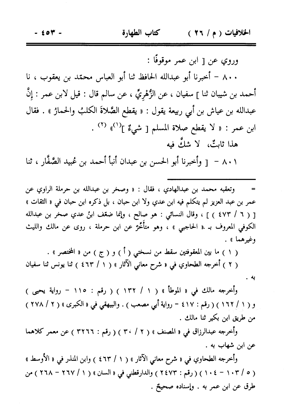 800- أخبرنا أبو عبد الله الحافظ ثنا أبو العباس محمد بن يعقوب، نا أحمد بن شيبان ثنا] سفيان، عن الزهري، عن سالم قال: قيل لابن عمر: إن عبد الله بن عياش بن أبي ربيعة يقول: ((يقطع الصلاة الكلب والحمار)). فقال ابن عمر: ((لا يقطع صلاة المسلم [شيءٌ])).