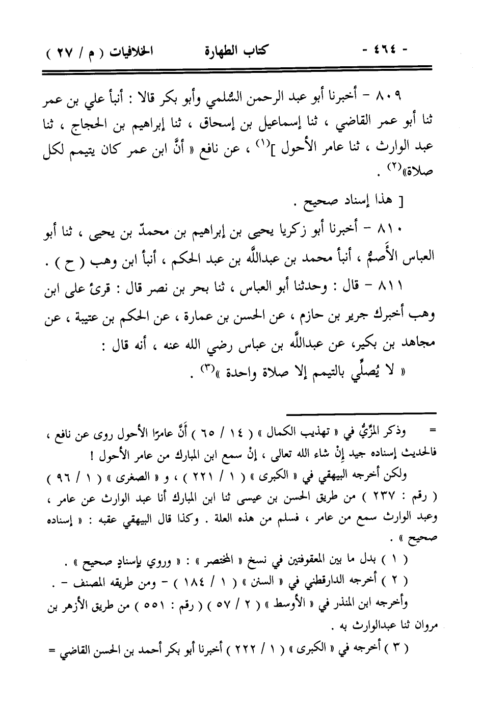 809- أخبرنا أبو عبد الرحمن السلمي وأبو بكر قالا: أنبأ علي بن عمر ثنا أبو عمر القاضي، ثنا إسماعيل بن إسحاق، ثنا إبراهيم بن الحجاج، ثنا عبد الوارث، ثنا عامر الأحول]، عن نافع ((أن ابن عمر كان يتيمم لكل صلاة)).