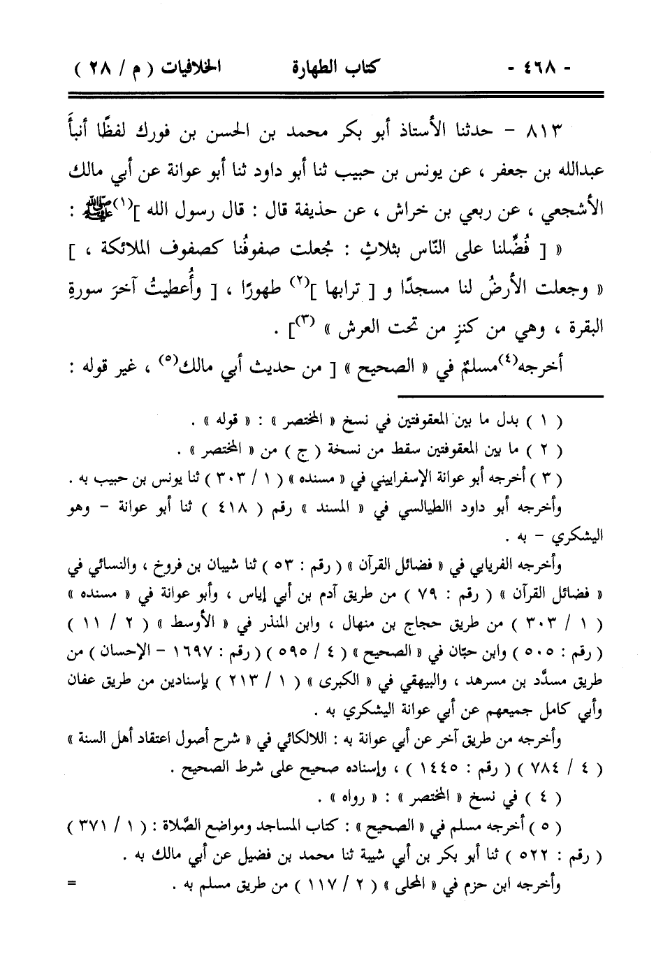 813- حدثنا الأستاذ أبو بكر محمد بن الحسن بن فورك لفظاً أنبأ عبد الله بن جعفر، عن يونس بن حبيب ثنا أبو داود ثنا أبو عوانة عن أبي مالك الأشجعي، عن ربعي بن خراش، عن حذيفة، قال: قال رسول الله] صلى الله عليه وسلم :