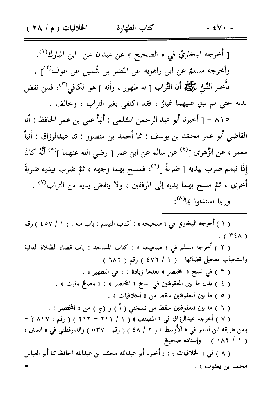 815- [أخبرنا أبو عبد الرحمن السلمي: أنبأ علي بن عمر الحافظ: أنا القاضي أبو عمر محمد بن يوسف: ثنا أحمد بن منصور: ثنا عبد الرزاق: أنبأ معمر، عن الزهري] عن سالم عن ابن عمر [رضي الله عنهما] أنه كان إذا تيمم ضرب بيديه [ضربةً]، فمسح بهما وجهه، ثم ضرب بيديه ضربةً أخرى، ثم مسح بهما يديه إلى المرفقين، ولا ينفض يديه من التراب.