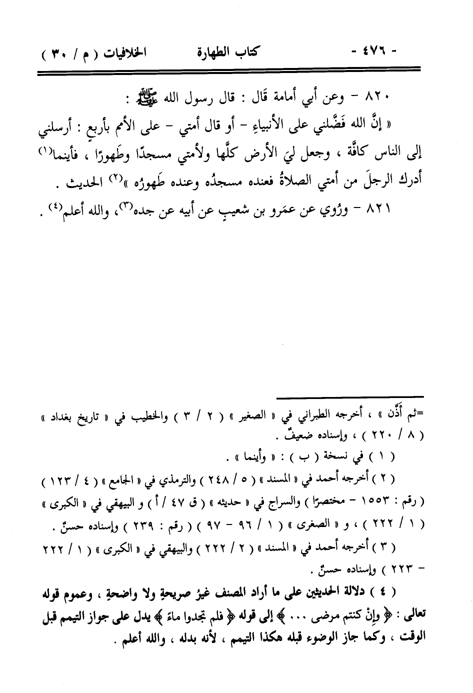 ((إن الله فضلني على الأنبياء -أو قال أمتي- على الأمم بأربعٍ: أرسلني إلى الناس كافة، وجعل لي الأرض كلها ولأمتي مسجداً وطهوراً، فأينما أدرك الرجل من أمتي الصلاة فعنده مسجده وعنده طهوره)) الحديث.