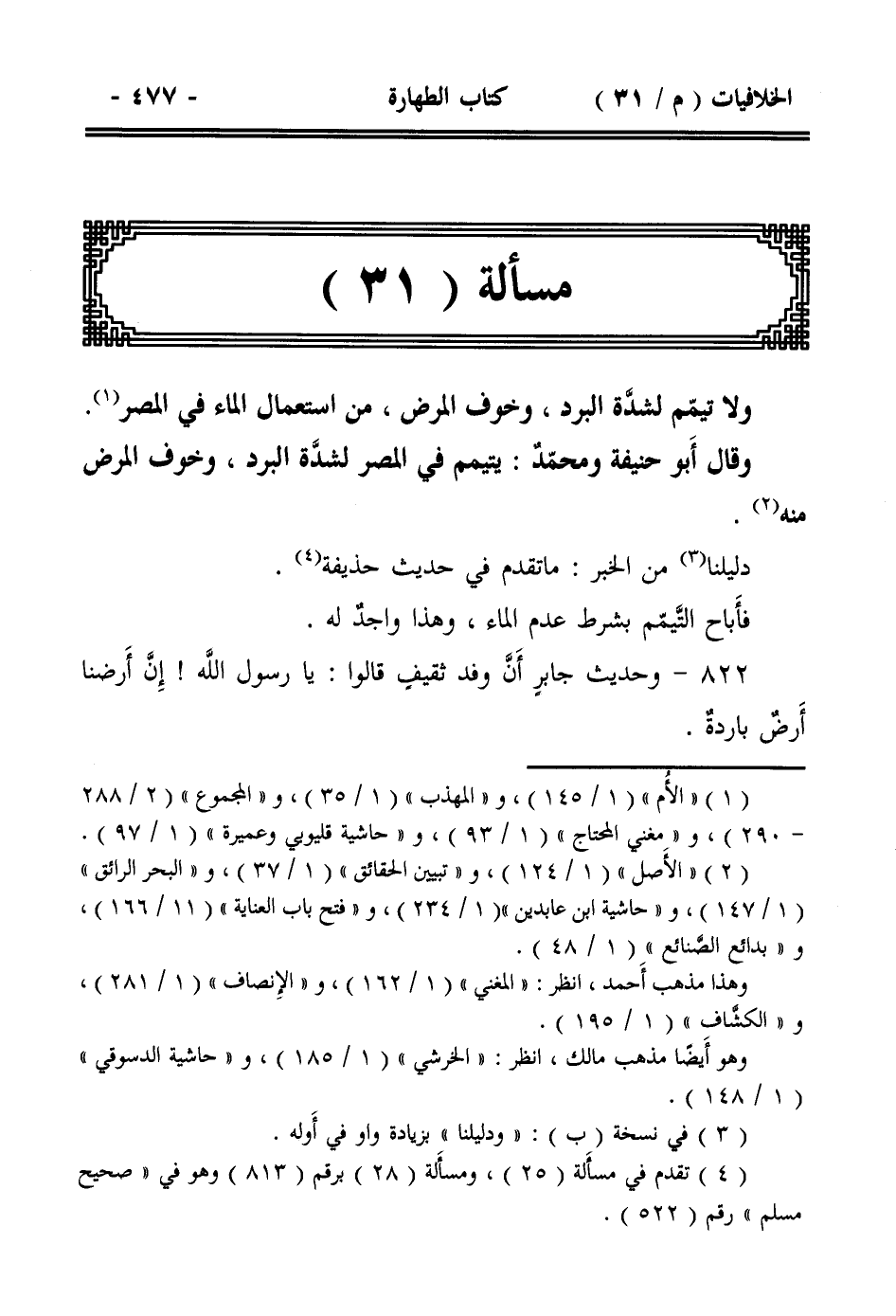 مسألة (31): ولا تيمم لشدة البرد، وخوف المرض، من استعمال الماء في المصر.
