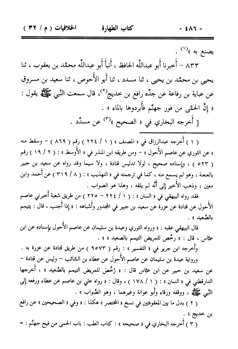 833- أخبرنا أبو عبد الله الحافظ، أنبأ أبو عبد الله محمد بن يعقوب، ثنا يحيى بن محمد بن يحيى، ثنا مسدد، ثنا أبو الأحوص، ثنا سعيد بن مسروق عن عباية بن رفاعة عن جده رافع بن خديج، قال سمعت النبي صلى الله عليه وسلم يقول: ((إن الحمى من فور جهنم فأبردوها بالماء)).