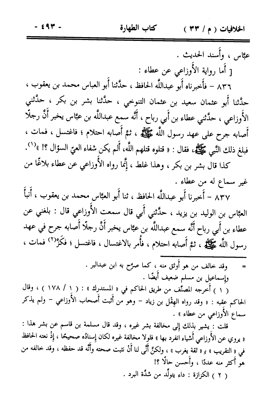 837- أخبرنا أبو عبد الله الحافظ، ثنا أبو العباس محمد بن يعقوب، أنبأ العباس بن الوليد بن يزيد، حدثني أبي قال سمعت الأوزاعي قال: بلغني عن عطاء بن أبي رباح أنه سمع عبد الله بن عباس يخبر أن رجلاً أصابه جرح في عهد رسول الله صلى الله عليه وسلم ، ثم أصابه احتلام، فأمر بالاغتسال، فاغتسل؛ فكز فمات،