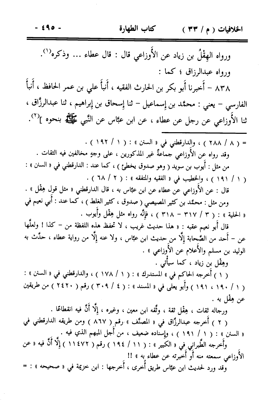 838- أخبرنا أبو بكر بن الحارث الفقيه، أنبأ علي بن عمر الحافظ، أنبأ الفارسي -يعني: محمد بن إسماعيل- ثنا إسحاق بن إبراهيم، ثنا عبد الرزاق، ثنا الأوزاعي عن رجل عن عطاء، عن ابن عباس عن النبي صلى الله عليه وسلم بنحوه].