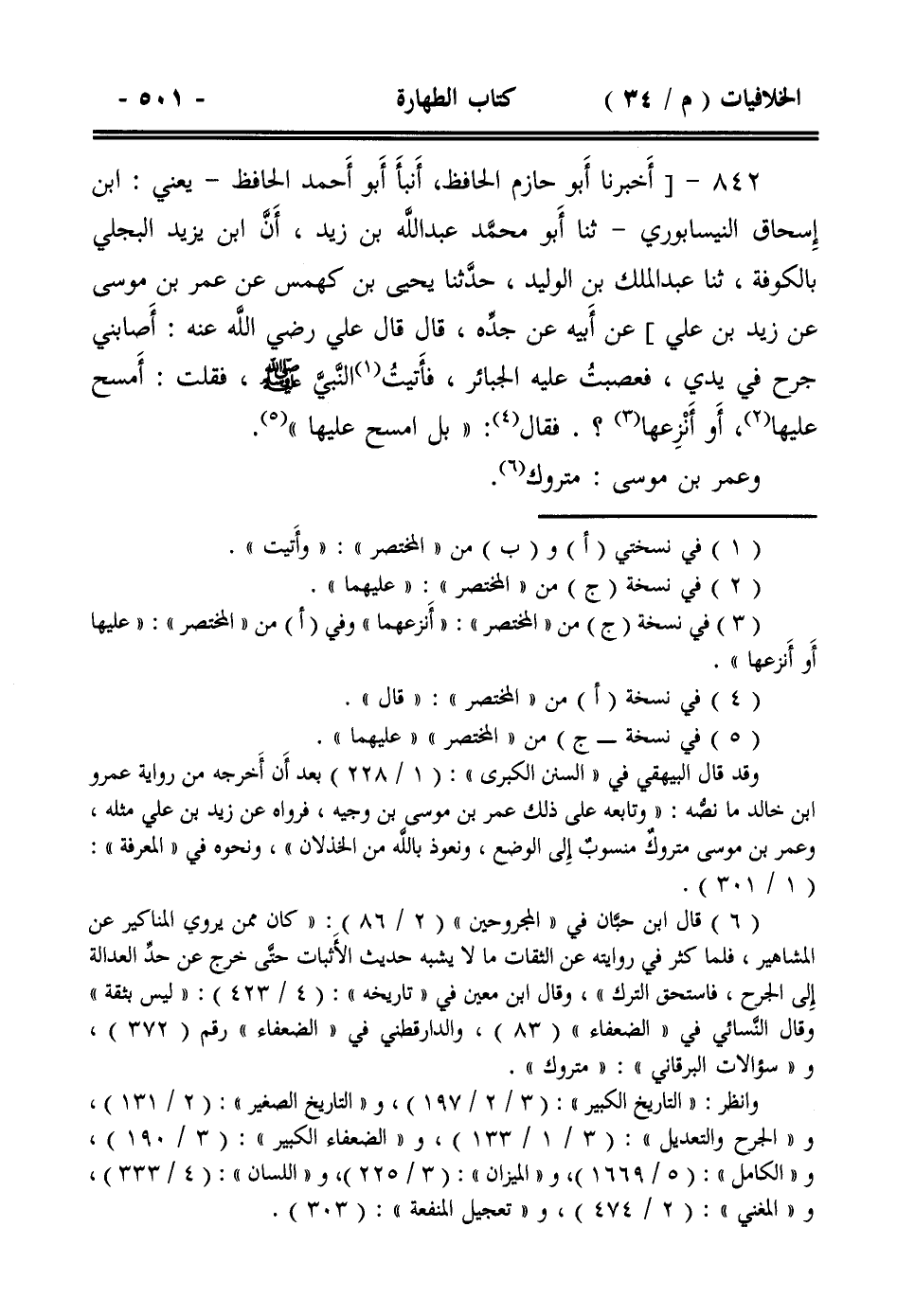 842- [أخبرنا أبو حازم الحافظ، أنبأ أبو أحمد الحافظ -يعني: ابن إسحاق النيسابوري- ثنا أبو محمد عبد الله بن زيد، أن ابن يزيد البجلي بالكوفة، ثنا عبد الملك بن الوليد، حدثنا يحيى بن كهمس عن عمر بن موسى عن زيد بن علي] عن أبيه عن جده، قال قال علي رضي الله عنه: أصابني جرح في يدي، فعصبت عليه الجبائر، فأتيت النبي صلى الله عليه وسلم ، فقلت: أمسح عليها، أو أنزعها؟. فقال: ((بل امسح عليها)).